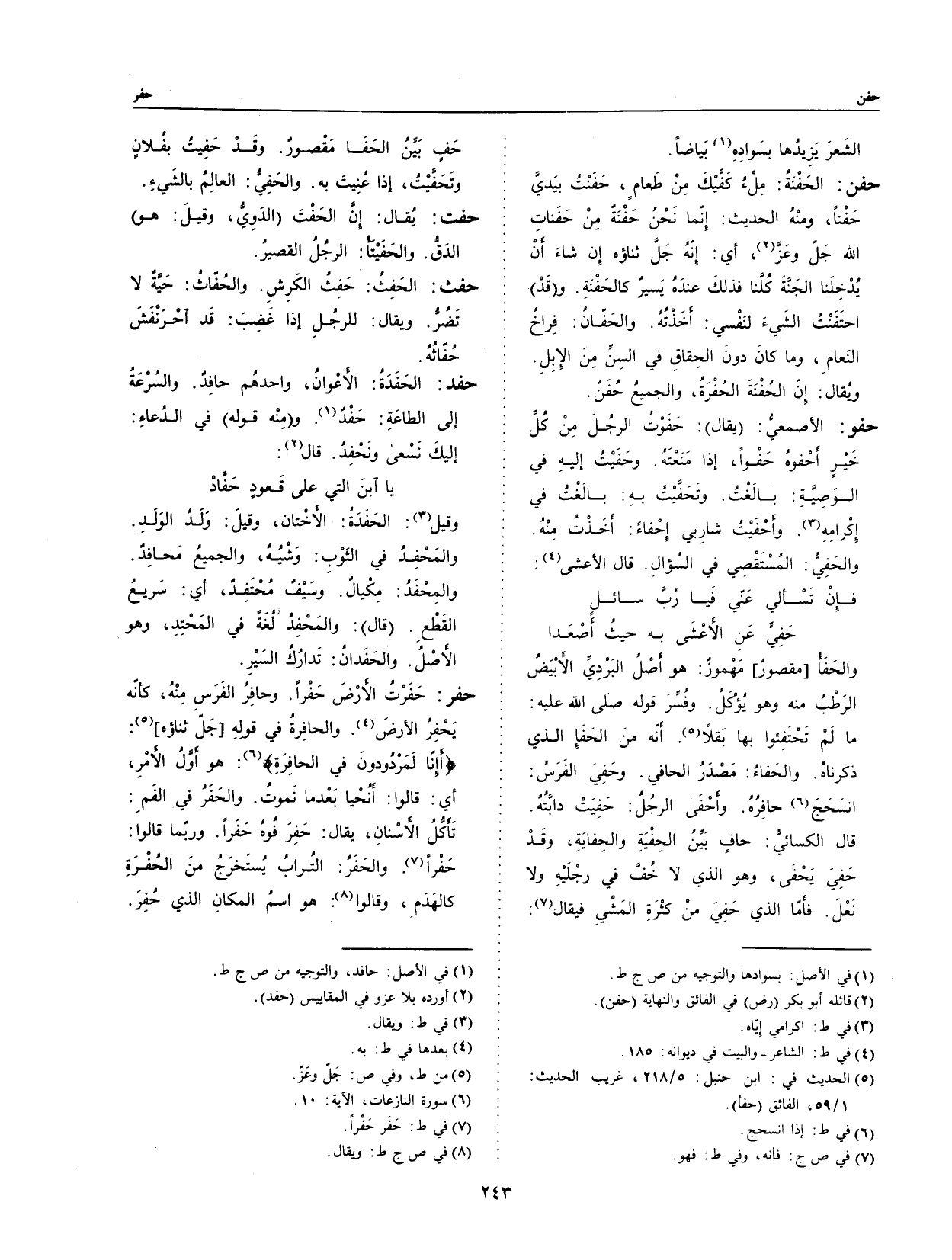 قال الكسائي: حافٍ بين الحفية والحفاية، وقد حفي يحفى، وهو الذي لا خفَّ في رجليه ولا نعل.