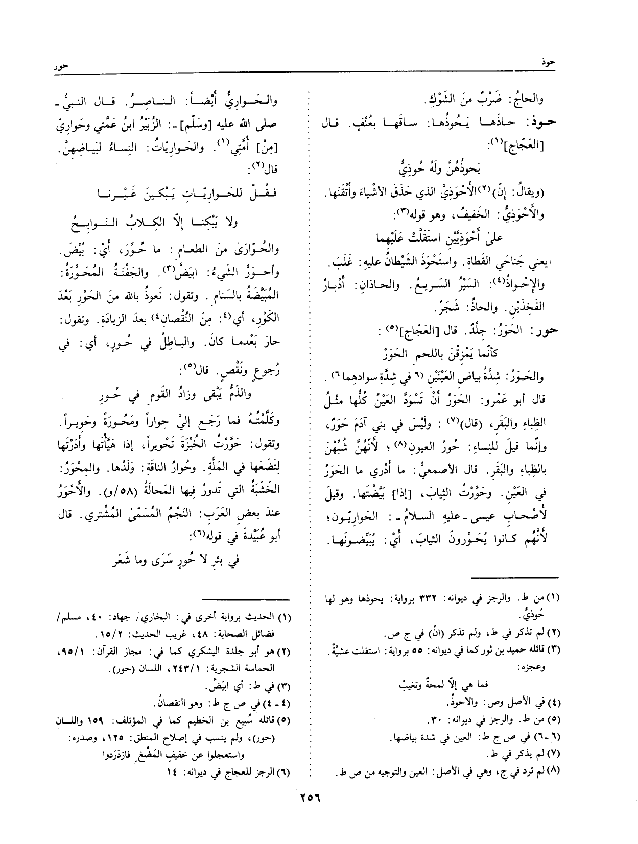 قال أبو عمرو: الحور أن تسود العينُ كلها مثل الظباء والبقر، (قال) : وليس في بني آدم حور، وإنما قيل للنساء: حور العيون؛ لأنهن شبهن بالظباء والبقر.