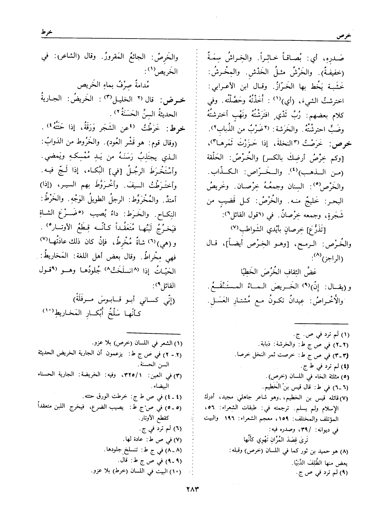 خرص: خرصتُ النخلة، إذا خرزت ثمرها، [وكم خرص أرضك بالكسر] والخرص: الحلقة (من الذهب) .