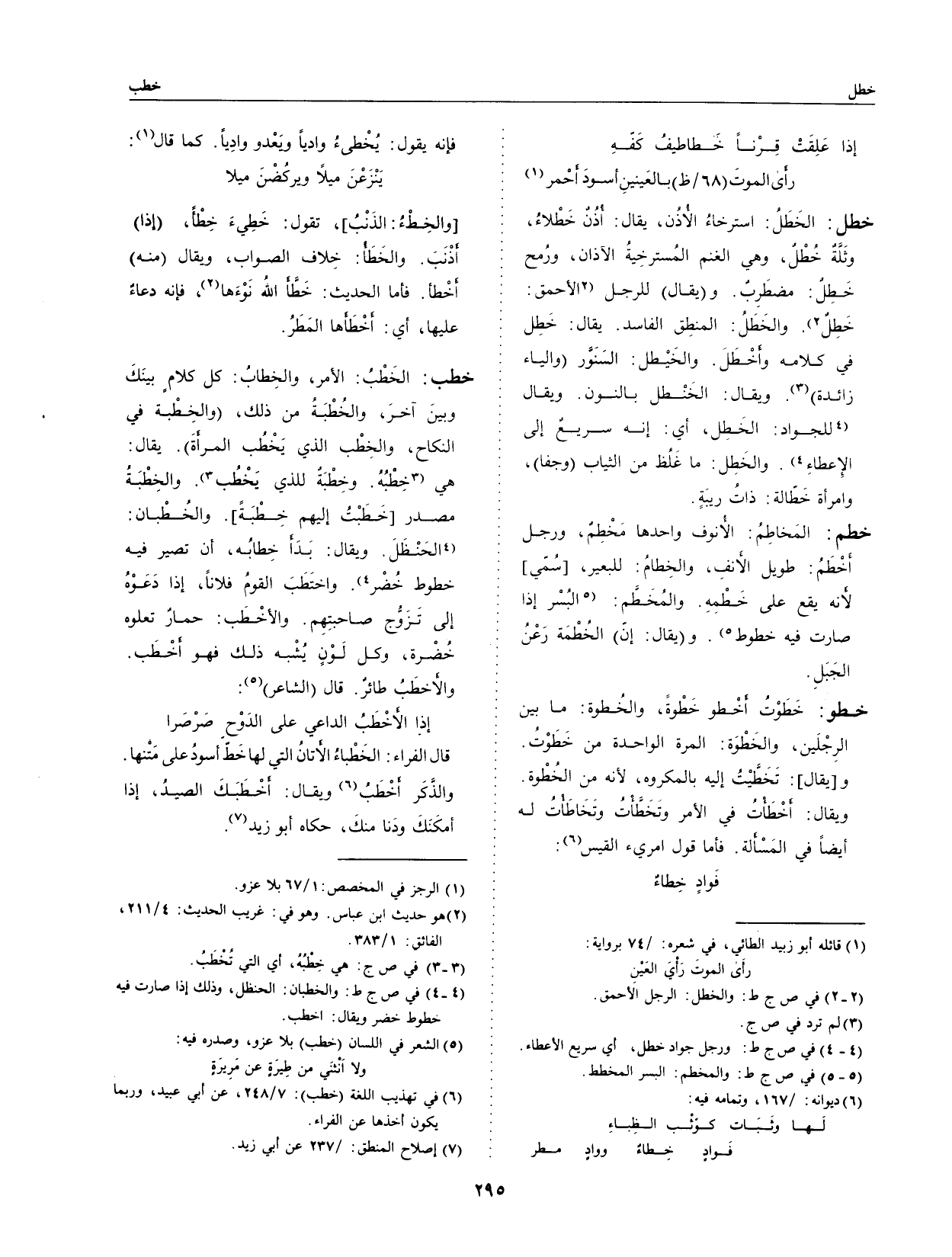خطل: الخطلُ: استرخاءُ الأذن، يقال: أذن خطلاءُ، وثلةُ خطلٌ، وهي الغنم المسترخية الآذان، ورمح خطلٌ: مضطرب.