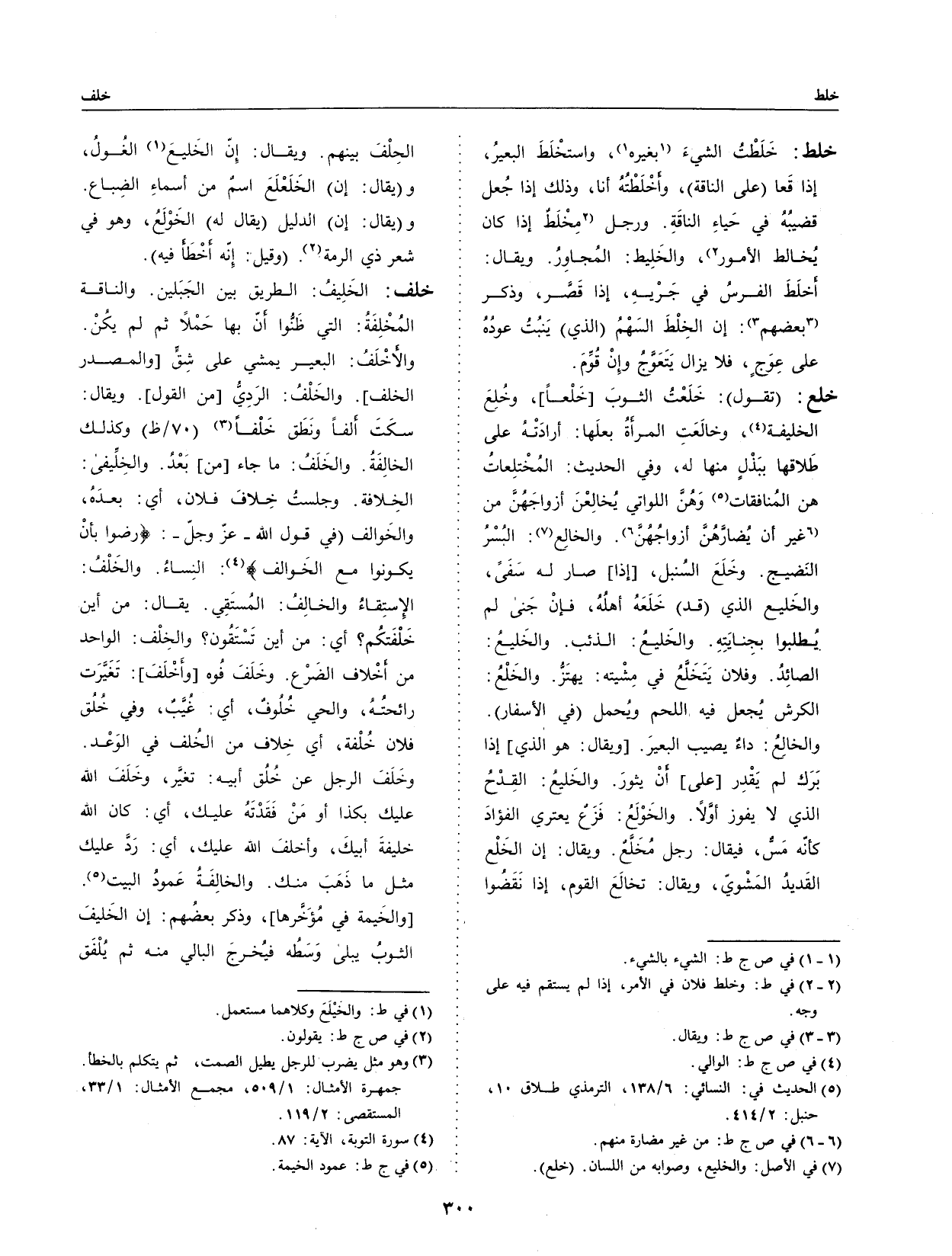 وخلف الرجل عن خلُق أبيه: تغير، وخلف الله عليك بكذا أو من فقدتهُ عليك، أي: كان الله خليفة أبيك، وأخلف الله عليك، أي: رد عليك مثل ما ذهب منك.