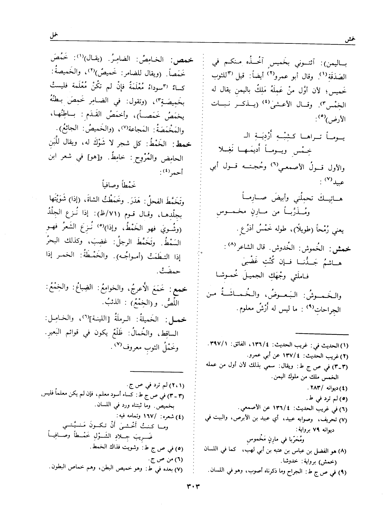 وقال أبو عمرو أيضاً: قيل للثوب خميس؛ لأن أول من عملهُ ملك باليمن يقال له الخميس.