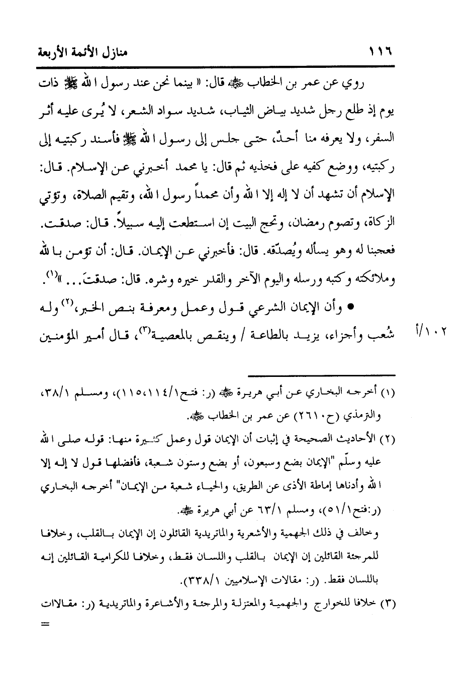 - وأن الإيمان الشرعي قول وعمل ومعرفة بنص الخبر،2 وله شُعب وأجزاء، يزيد بالطاعة] 102/أ [وينقص بالمعصية3، قال أمير المؤمنين