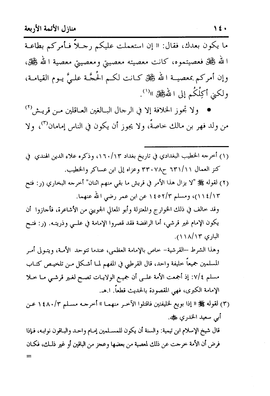 - ولا تجوز الخلافة إلا في الرجال البالغين العاقلين من قريش2 من ولد فهر بن مالك خاصةً، ولا يجوز أن يكون في الناس إمامان3، ولا