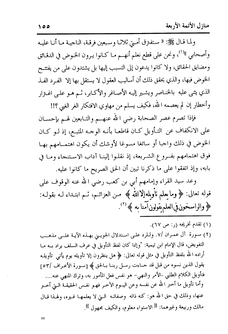 2 سورة آل عمران /7. وللرد على استدلال الجويني بهذه الآية على مذهب التفويض، قال الإمام ابن تيمية: "وإنما كان لفظ التأويل في عرف السلف يراد به ما أراده الله بلفظ التأويل في مثل قوله تعالى: {هَلْ يَنْظُرُونَ إِلاَّ تَأْوِيلَهُ يَوْمَ يَأْتِي تَأْوِيلُهُ يَقُولُ الَّذِينَ نَسُوهُ مِنْ قَبْلُ قَدْ جَاءَتْ رُسُلُ رَبِّنَا بِالْحَق} [سورة الأعراف /53] فتأويل الكلام الطلبي - الأمر والنهي- هو نفس فعل المأمور به، وترك المنهي عنه….