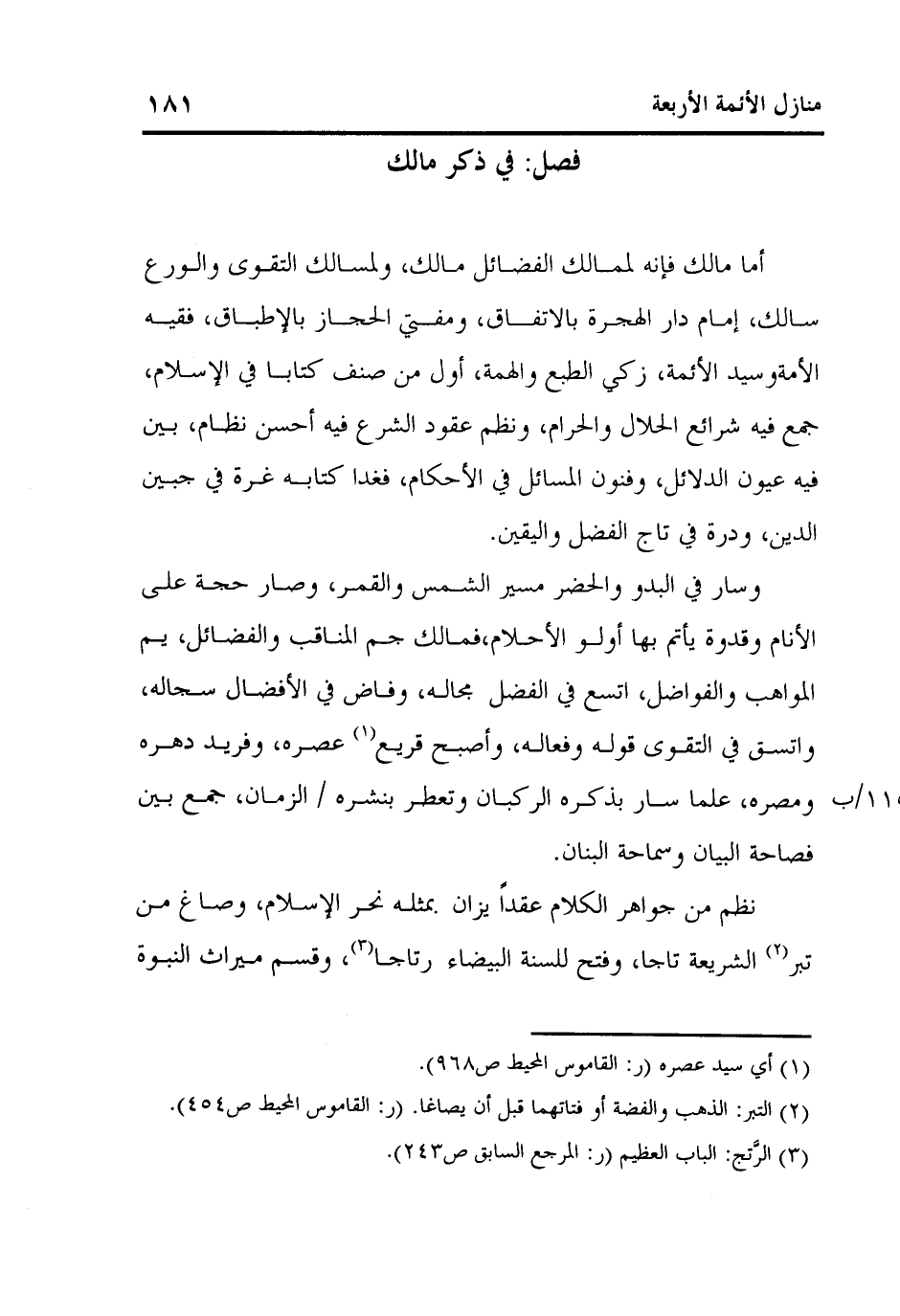 أما مالك فإنه لممالك الفضائل مالك، ولمسالك التقوى والورع سالك، إمام دار الهجرة بالاتفاق، ومفتي الحجاز بالإطباق، فقيه الأمةوسيد الأئمة، زكي الطبع والهمة، أول من صنف كتابا في الإسلام، جمع فيه شرائع الحلال والحرام، ونظم عقود الشرع فيه أحسن نظام، بين فيه عيون الدلائل، وفنون المسائل في الأحكام، فغدا كتابه غرة في جبين الدين، ودرة في تاج الفضل واليقين.