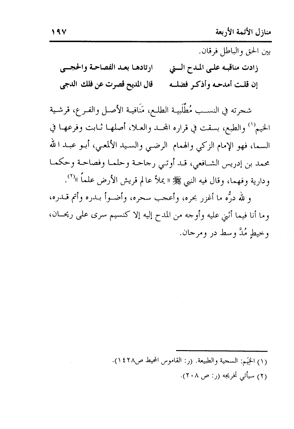 شجرته في النسب مُطَّلَبية الطلع، مَنَافية الأصل والفرع، قرشية الخيم1 والطبع، بسقت في قراره المجد والعلا، أصلها ثابت وفرعها في السما، فهو الإمام الزكي والهمام الرضي والسيد الألمعي، أبو عبد الله محمد بن إدريس الشافعي، قد أوتي رجاحة وحلما وفصاحة وحكما ودارية وفهما، وقال فيه النبي صلى الله عليه وسلم: "يملأ عالم قريش الأرض علماً"2