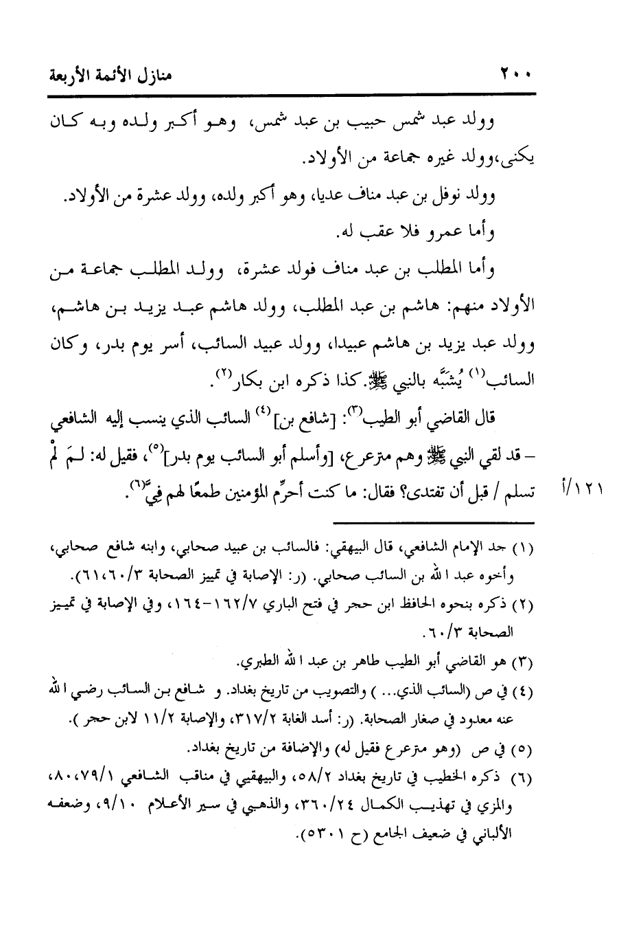 قال القاضي أبو الطيب3: [شافع بن] 4 السائب الذي ينسب إليه الشافعي - قد لقي النبي صلى الله عليه وسلم وهم مترعرع، [وأسلم أبو السائب يوم بدر] 5، فقيل له: لمَ لمْ تسلم /121] أ [قبل أن تفتدى؟ فقال: ما كنت أحرِّم المؤمنين طمعًا لهم فِيَّ6.