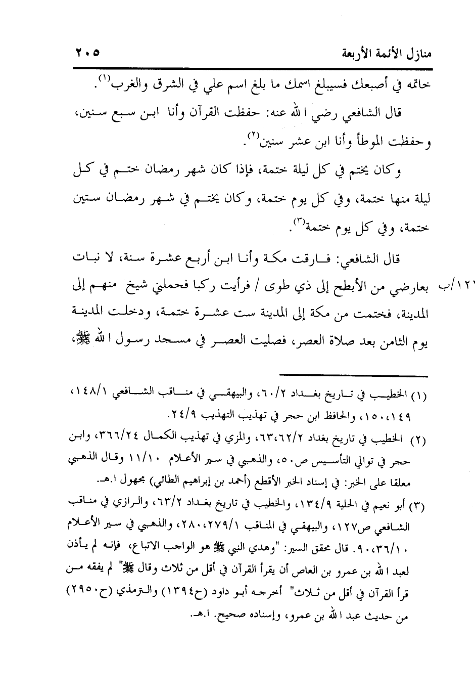3 أبو نعيم في الحلية 9/134، والخطيب في تاريخ بغداد 2/63، والرازي في مناقب الشافعي ص127، والبيهقي في المناقب 1/279،280، والذهبي في سير الأعلام 10/36،90. قال محقق السير: "وهدي النبي صلى الله عليه وسلم هو الواجب الاتباع، فإنه لم يأذن لعبد الله بن عمرو بن العاص أن يقرأ القرآن في أقل من ثلاث وقال صلى الله عليه وسلم: "لم يفقه من قرأ القرآن في أقل من ثلاث" أخرجه أبو داود (ح1394) والترمذي (ح2950) من حديث عبد الله بن عمرو، وإسناده صحيح. اهـ