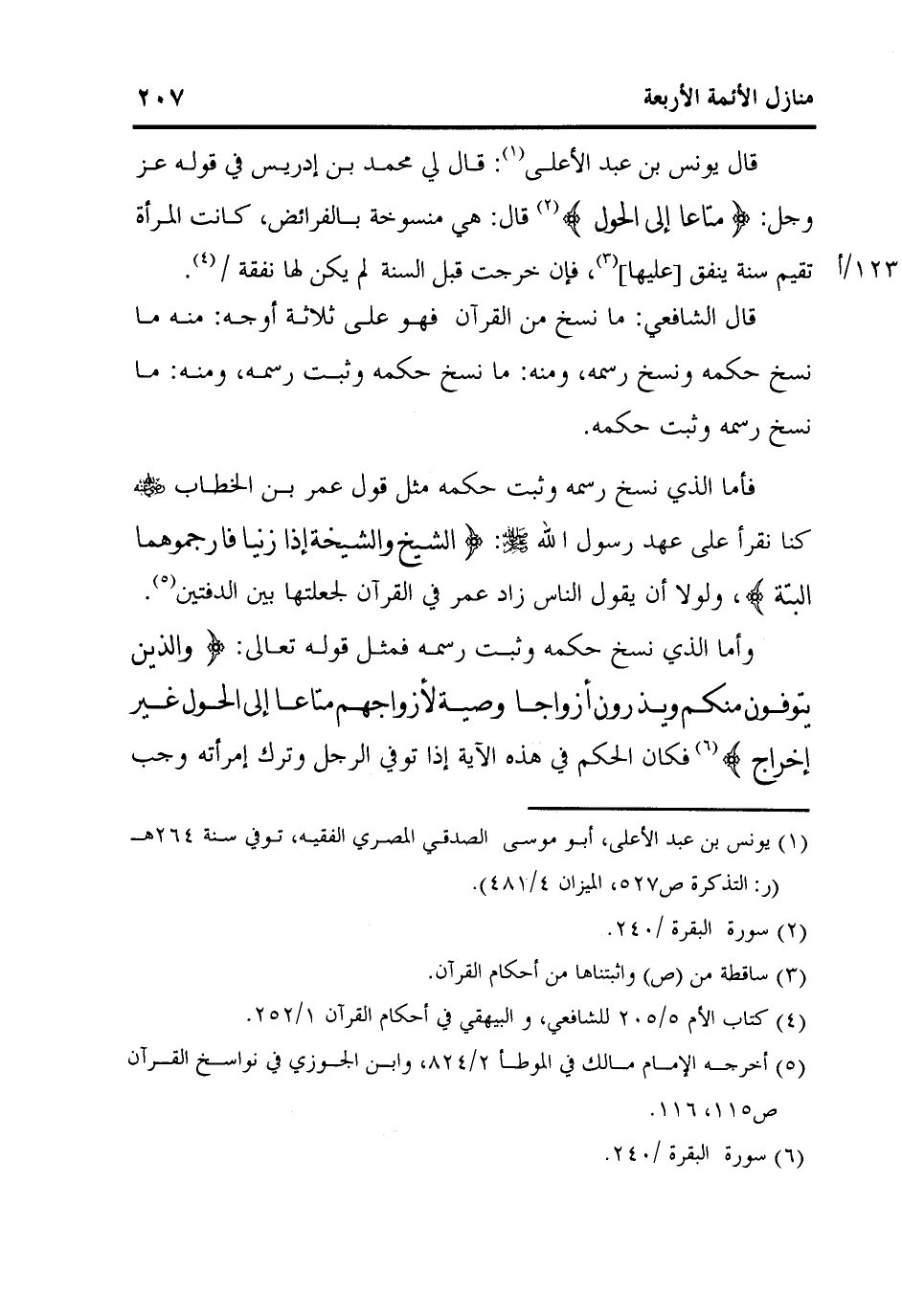 قال يونس بن عبد الأعلى1: قال لي محمد بن إدريس في قوله عز وجل: {مَتَاعاً إِلَى الْحَوْلِ} 2 قال: هي منسوخة بالفرائض، كانت المرأة تقيم سنة ينفق [عليها] 3، فإن خرجت قبل السنة لم يكن لها نفقة /123] أ 4 [.