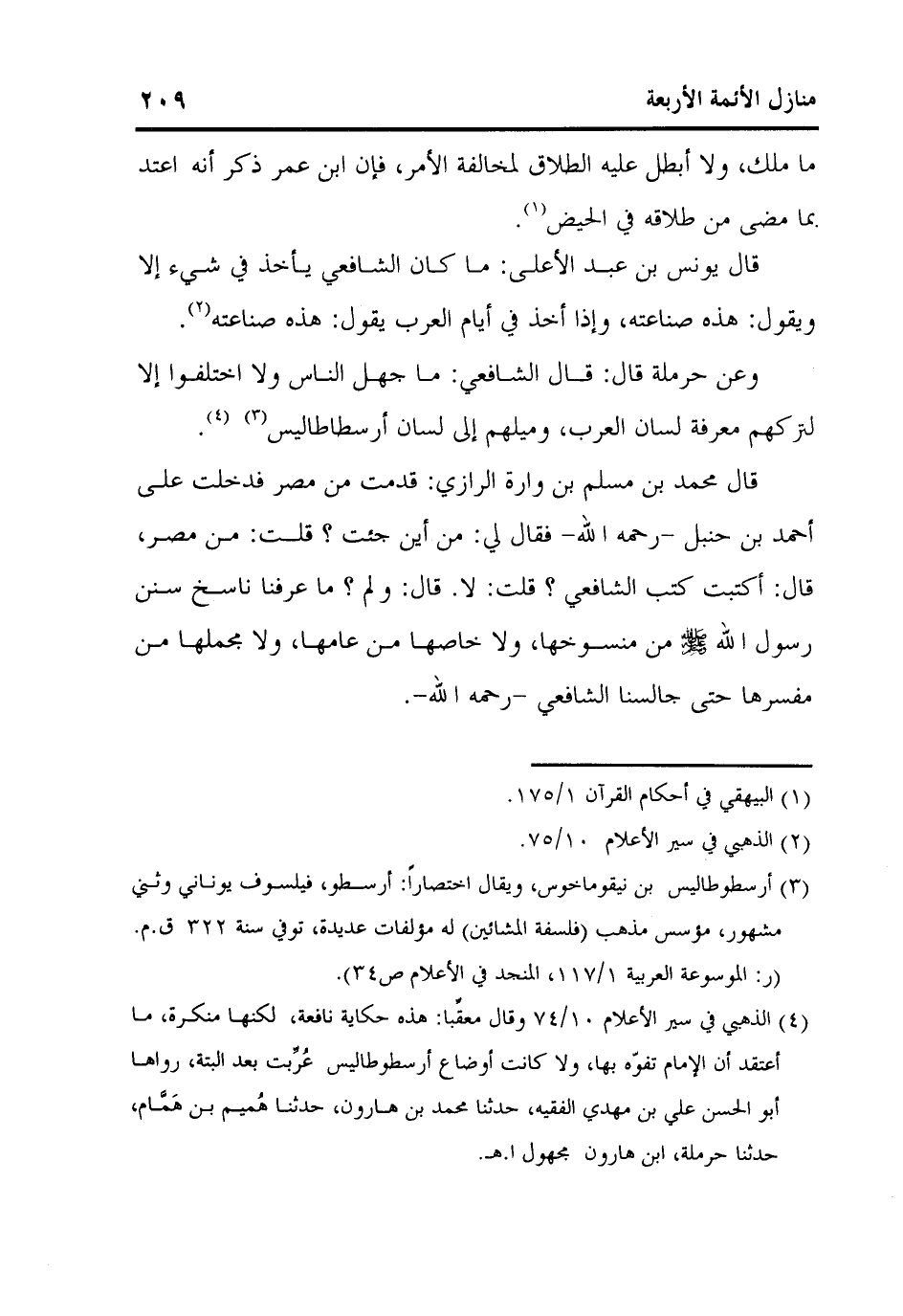 4 الذهبي في سير الأعلام 10/74 وقال معقِّبا: هذه حكاية نافعة، لكنها منكرة، ما أعتقد أن الإمام تفوّه بها، ولا كانت أوضاع أرسطوطاليس عُرِّبت بعد البتة، رواها أبو الحسن علي بن مهدي الفقيه، حدثنا محمد بن هارون، حدثنا هُميم بن هَمَّام، حدثنا حرملة، ابن هارون مجهول. اهـ