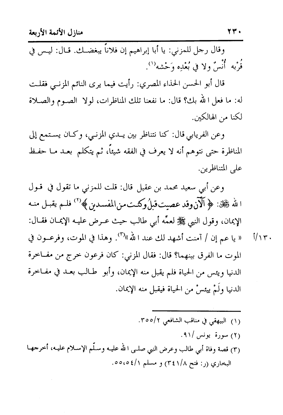 وعن أبي سعيد محمد بن عقيل قال: قلت للمزني ما تقول في قول الله عز وجل: {آلآنَ وَقَدْ عَصَيْتَ قَبْلُ وَكُنْتَ مِنَ الْمُفْسِدِينَ} 2 فلم يقبل منه الإيمان، وقول النبي صلى الله عليه وسلم لعمِّه أبي طالب حيث عرض عليه الإيمان فقال: "يا عم إن] 130/أ [آمنت أشهد لك عند الله"3. وهذا في الموت، وفرعون في الموت ما الفرق بينهما؟ قال: فقال المزني: كان فرعون خرج من مفاخرة الدنيا ويئس من الحياة فلم يقبل منه الإيمان، وأبو طالب بعد في مفاخرة الدنيا ولَمْ ييئسْ من الحياة فيقبل منه الإيمان.