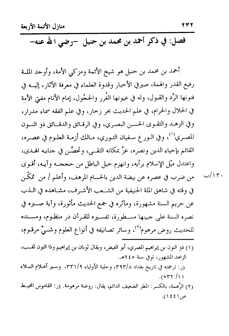 أحمد بن محمد بن حنبل هو شيخ الأئمة ومزكي الأمة، وأوحد الملة رفيع القدر والهمة، صيرفي الأخبار وقدوة العلماء في معرفة الآثار، إليه في فنونها الرَّد والقبول، وله في عيونها الغُرر والحجُول، إمام الأنام مفتي الأمة في الحلال والحرام، في علم الحديث بحر زخار، وفي علم الفقه سماء مدرار، وفي الزهد والتقوى الحسن البصري، وفي الرقائق والدقائق ذو النون المصري1، وفي الورع سفيان الثوري، مالك أزمة العلوم في عصره، القائم بإحياء الدين ونصره، عزَّ بمكانه التقى، وتحصَّن في جنابه الهدى، واعتدل ميْل الإسلام برأيه، وانهزم خيل الباطل من حججه وآيه، أقوى من ضرب في عصره عن بيضة الدين بالحسام المرهف، وأعلم] 130/ب [من تمكّن في وقته في شاهق الملة الحنيفية من الشعب الأشرف، مشاهده في الذب عن حريم السنة مشهورة، ومآثره في جمع الحديث مأثورة، وآية صبره في نصره السنة على جبينها مسطورة، تفسيره للقرآن در منظوم، ومسنده للحديث روض مرهوم2، وسائر تصانيفه في أنواع العلوم وشيٌ مرقوم،