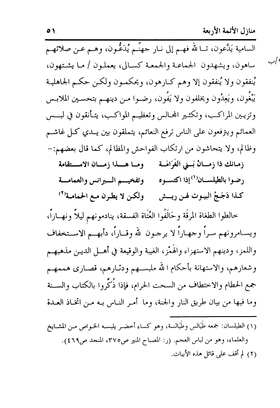السامية يَدَّعون، تالله فهم إلى نار جهنّم يُدَعُّون، وهم عن صلاتهم ساهون، ويشهدون الجماعة والجمعة كسالى، يعملون] 90/ب [ما يشتهون، يُنفقون ولا يُنفقون إلا وهم كارهون، ويحكمون ولكن حكم الجاهلية يَبْغُون، ويَعِدُون ويخلفون ولا يَفُون، رضوا من دينهم بتحسين الملابس وتزيين المراكب، وتكثير المجالس وتعظيم المواكب، يتأنقون في لبس العمائم ويترفعون على الناس ترفع النعائم، يتملقون بين يدي كل غاشم وظالم، ولا يتحاشون من ارتكاب الفواحش والمظالم، كما قال بعضهم: