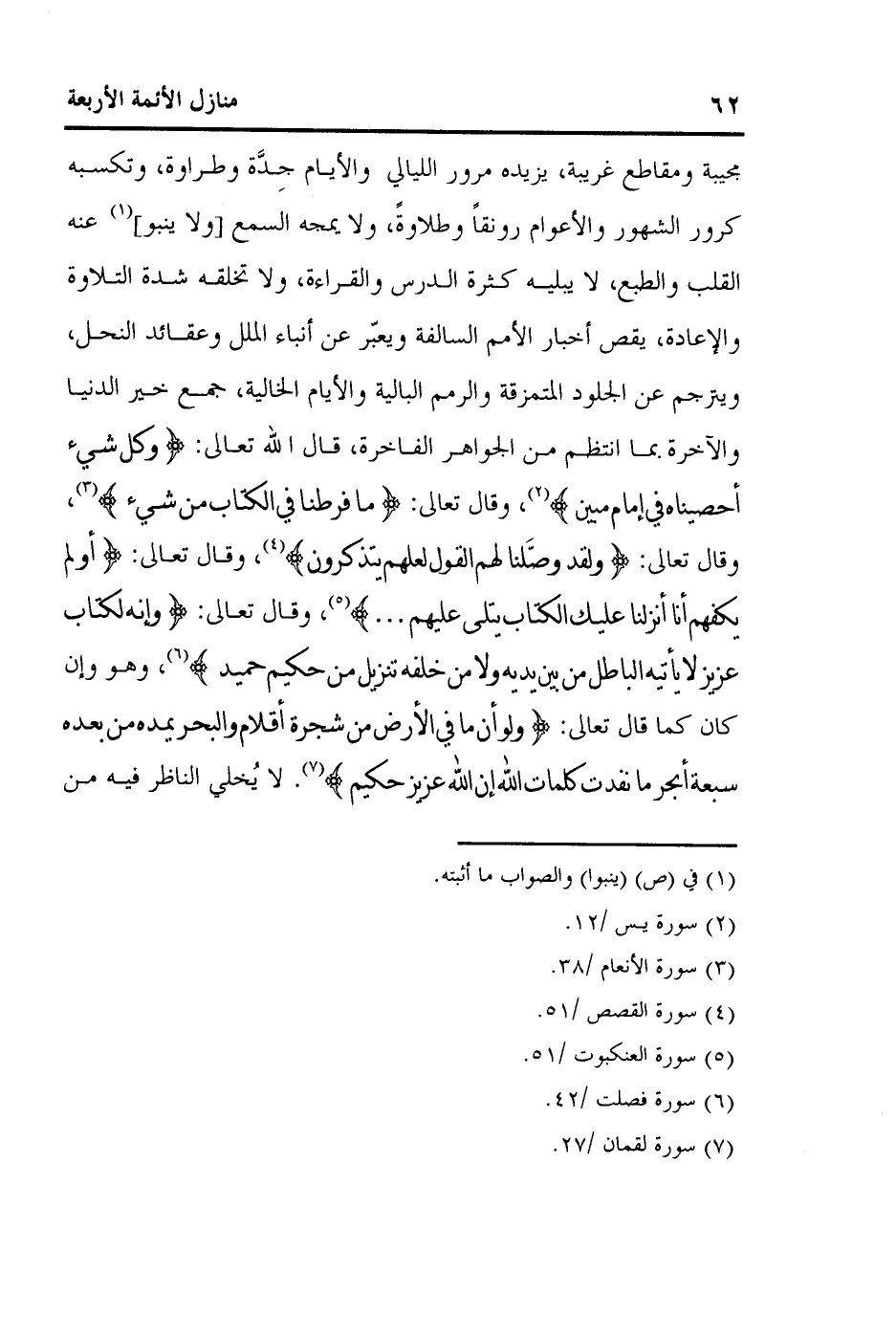 مجيبة ومقاطع غريبة، يزيده مرور الليالي والأيام جِدَّة وطراوة، وتكسبه كرور الشهور والأعوام رونقاً وطلاوةً، ولا يمجه السمع [ولا ينبو] 1 عنه القلب والطبع، لا يبليه كثرة الدرس والقراءة، ولا تخلقه شدة التلاوة والإعادة، يقص أخبار الأمم السالفة ويعبّر عن أنباء الملل وعقائد النحل، ويترجم عن الجلود المتمزقة والرمم البالية والأيام الخالية، جمع خير الدنيا والآخرة بما انتظم من الجواهر الفاخرة، قال الله تعالى: {وَكُلَّ شَيْءٍ أَحْصَيْنَاهُ فِي إِمَامٍ مُبِينٍ} 2، وقال تعالى: {مَا فَرَّطْنَا فِي الْكِتَابِ مِنْ شَيْءٍ} 3، وقال تعالى: {وَلَقَدْ وَصَّلْنَا لَهُمُ الْقَوْلَ لَعَلَّهُمْ يَتَذَكَّرُونَ} 4، وقال تعالى: {أَوَلَمْ يَكْفِهِمْ أَنَّا أَنْزَلْنَا عَلَيْكَ الْكِتَابَ يُتْلَى عَلَيْهِمْ} 5، وقال تعالى: {وَإِنَّهُ لَكِتَابٌ عَزِيزٌ لا يَأْتِيهِ الْبَاطِلُ مِنْ بَيْنِ يَدَيْهِ وَلا مِنْ خَلْفِهِ تَنْزِيلٌ مِنْ حَكِيمٍ حَمِيدٍ} 6، وهو وإن كان كما قال تعالى: {وَلَوْ أَنَّمَا فِي الأَرْضِ مِنْ شَجَرَةٍ أَقْلامٌ وَالْبَحْرُ يَمُدُّهُ مِنْ بَعْدِهِ سَبْعَةُ أَبْحُرٍ مَا نَفِدَتْ كَلِمَاتُ اللَّهِ إِنَّ اللَّهَ عَزِيزٌ حَكِيمٌ} 7. لا يُخلي الناظر فيه من