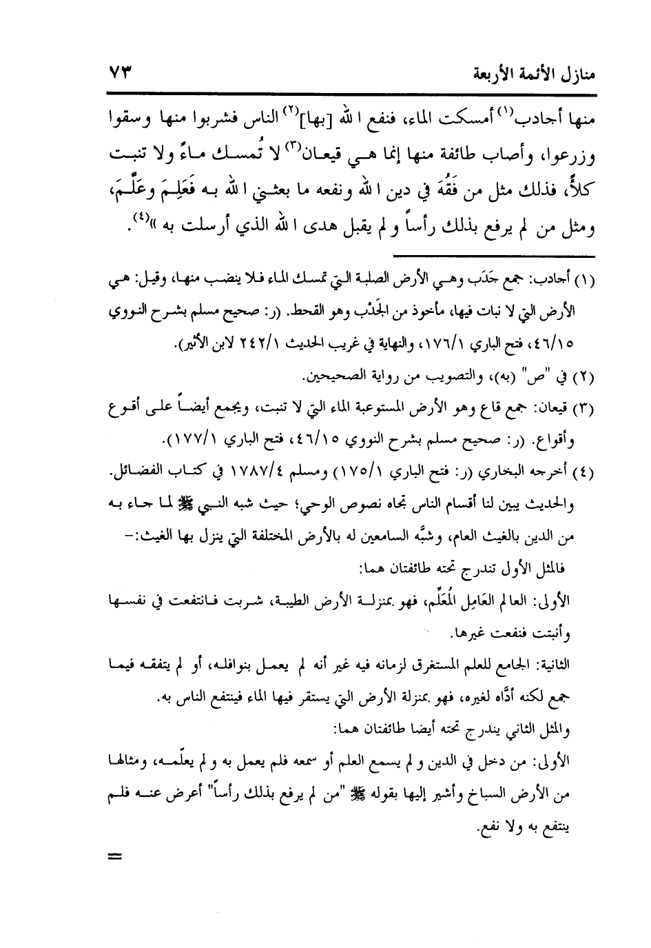 4 أخرجه البخاري (ر: فتح الباري 1/175) ومسلم 4/1787 في كتاب الفضائل. والحديث يبين لنا أقسام الناس تجاه نصوص الوحي، حيث شبه النبي صلى الله عليه وسلم لما جاء به من الدين بالغيث العام، وشبَّه السامعين له بالأرض المختلفة التي ينزل بها الغيث: