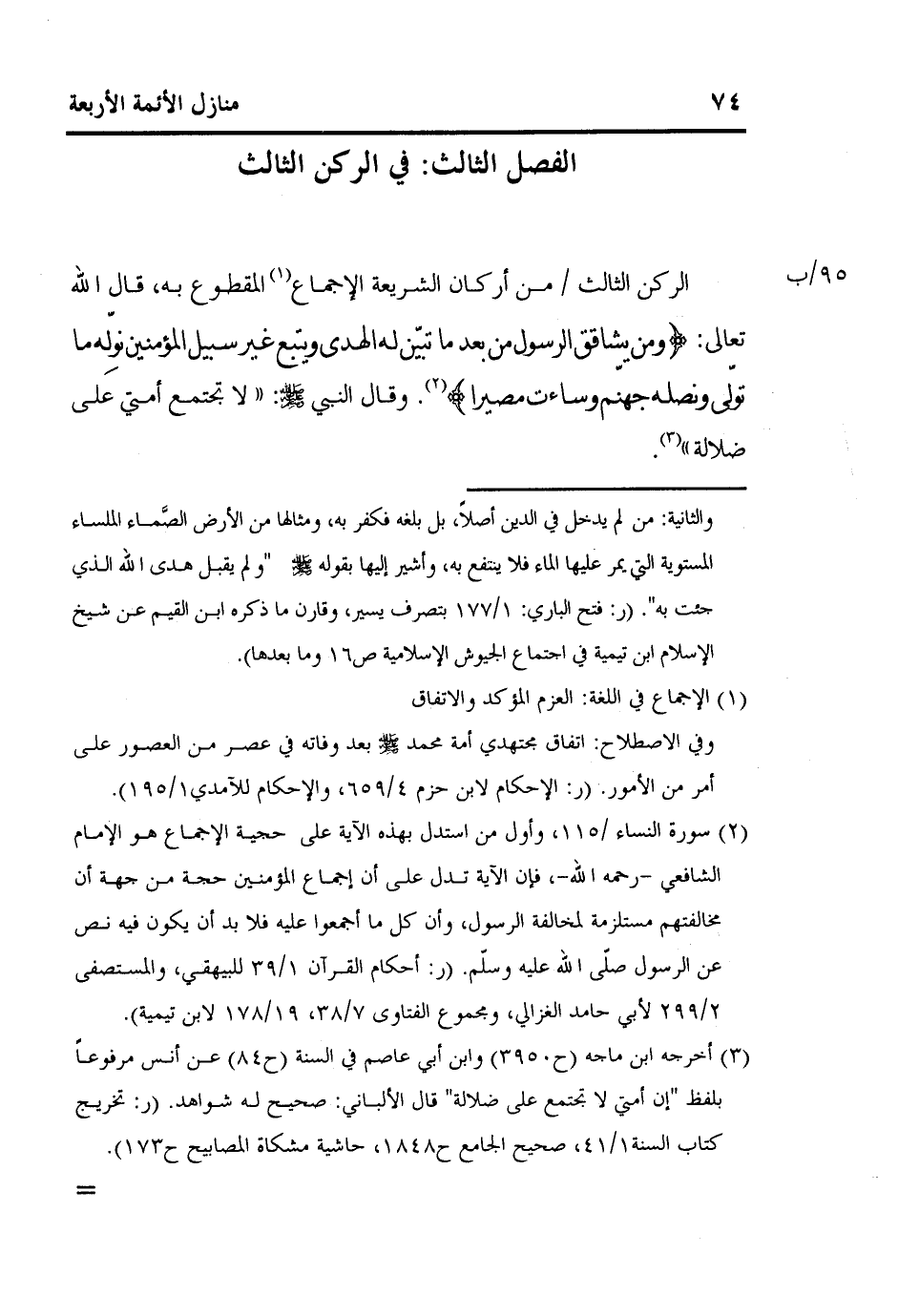 الركن الثالث] 95/ب [من أركان الشريعة الإجماع1 المقطوع به، قال الله تعالى: {وَمَنْ يُشَاقِقِ الرَّسُولَ مِنْ بَعْدِ مَا تَبَيَّنَ لَهُ الْهُدَى وَيَتَّبِعْ غَيْرَ سَبِيلِ الْمُؤْمِنِينَ نُوَلِّهِ مَا تَوَلَّى وَنُصْلِهِ جَهَنَّمَ وَسَاءَتْ مَصِيراً} 2. وقال النبي صلى الله عليه وسلم: "لا تجتمع أمتي على ضلالة" 3.
