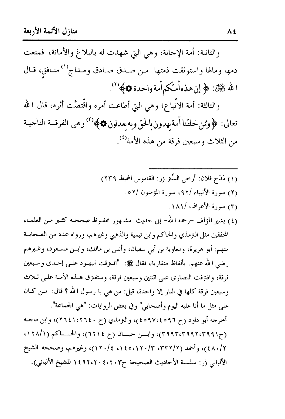 4 يشير المؤلف - رحمه الله- إلى حديث مشهور محفوظ صححه كثير من العلماء المحققين مثل الترمذي والحاكم وابن تيمية والذهبي وغيرهم، ورواه عدد من الصحابة منهم: أبو هريرة، ومعاوية بن أبي سفيان، وأنس بن مالك، وابن مسعود، وغيرهم رضي الله عنهم. بألفاظ متقاربة، فقال صلى الله عليه وسلم: "افترقت اليهود على إحدى وسبعين فرقة، وافترقت النصارى على اثنتين وسبعين فرقة، وستفترق هذه الأمة على ثلاث وسبعين فرقة كلها في النار إلا واحدة"، قيل: من هي يا رسول الله؟ قال: "من كان على مثل ما أنا عليه اليوم وأصحابي" وفي بعض الروايات: "هي الجماعة".