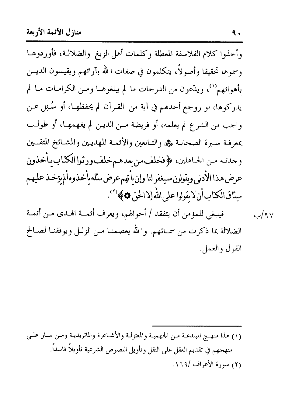 فينبغي للمؤمن أن يتفقد] 97/ب [أحوالهم، ويعرف أئمة الهدى من أئمة الضلالة بما ذكرت من سماتهم. والله يعصمنا من الزلل ويوفقنا لصالح القول والعمل.