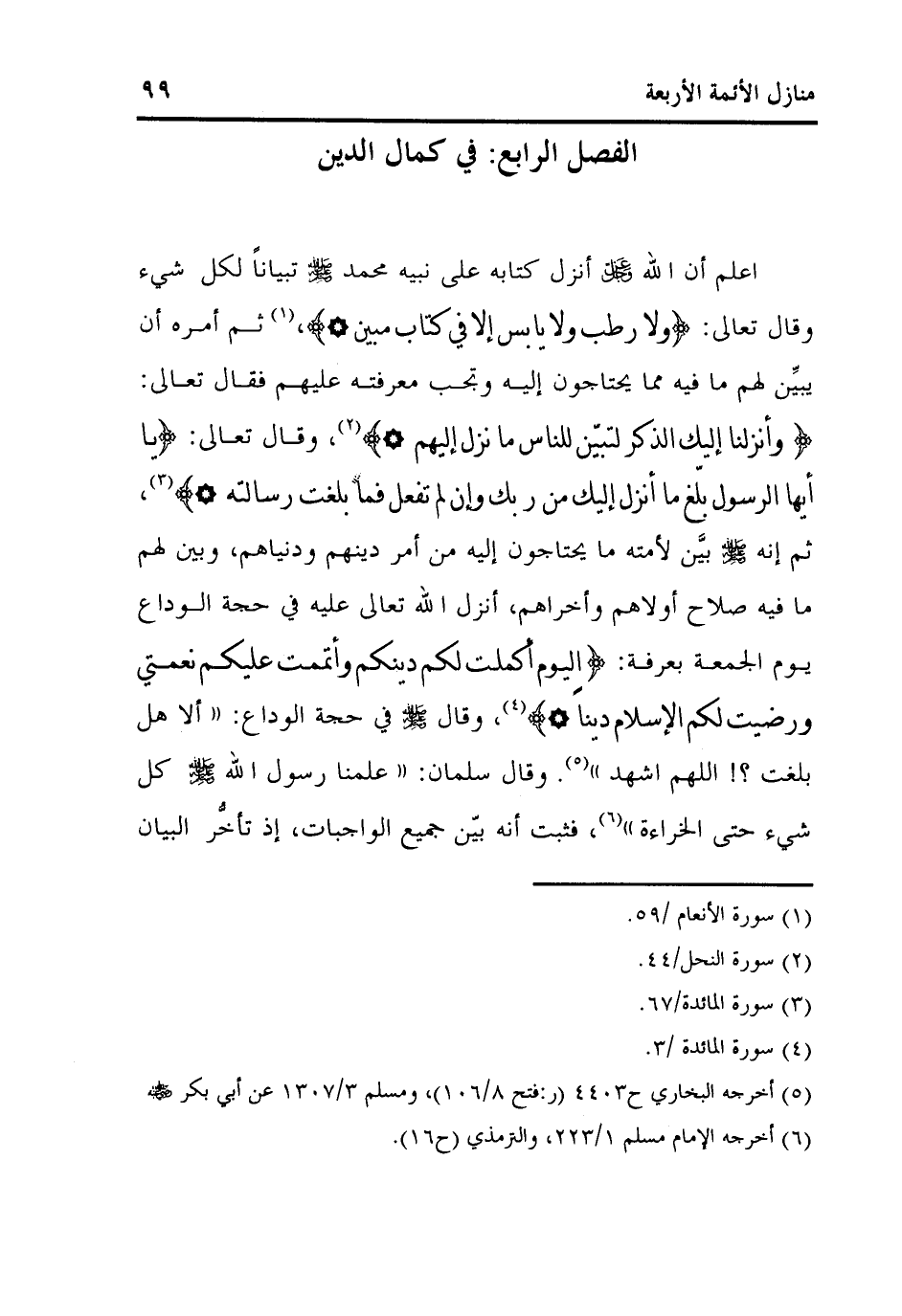 اعلم أن الله عز وجل أنزل كتابه على نبيه محمد صلى الله عليه وسلم تبياناً لكل شيء وقال تعالى: {وَلا رَطْبٍ وَلا يَابِسٍ إِلاَّ فِي كِتَابٍ مُبِينٍ} ،1 ثم أمره أن يبيِّن لهم ما فيه مما يحتاجون إليه وتجب معرفته عليهم فقال تعالى: {وَأَنْزَلْنَا إِلَيْكَ الذِّكْرَ لِتُبَيِّنَ لِلنَّاسِ مَا نُزِّلَ إِلَيْهِمْ} 2، وقال تعالى: {يَا أَيُّهَا الرَّسُولُ بَلِّغْ مَا أُنْزِلَ إِلَيْكَ مِنْ رَبِّكَ وَإِنْ لَمْ تَفْعَلْ فَمَا بَلَّغْتَ رِسَالَتَهُ} 3، ثم إنه صلى الله عليه وسلم بيَّن لأمته ما يحتاجون إليه من أمر دينهم ودنياهم، وبين لهم ما فيه صلاح أولاهم وأخراهم، أنزل الله تعالى عليه في حجة الوداع يوم الجمعة بعرفة: {الْيَوْمَ أَكْمَلْتُ لَكُمْ دِينَكُمْ وَأَتْمَمْتُ عَلَيْكُمْ نِعْمَتِي وَرَضِيتُ لَكُمُ الإِسْلامَ دِيناً} 4، وقال صلى الله عليه وسلم في حجة الوداع: "ألا هل بلغت؟! اللهم اشهد"5. وقال سلمان: "علمنا رسول الله صلى الله عليه وسلم كل شيء حتى الخراءة"6، فثبت أنه بيّن جميع الواجبات، إذ تأخُّر البيان