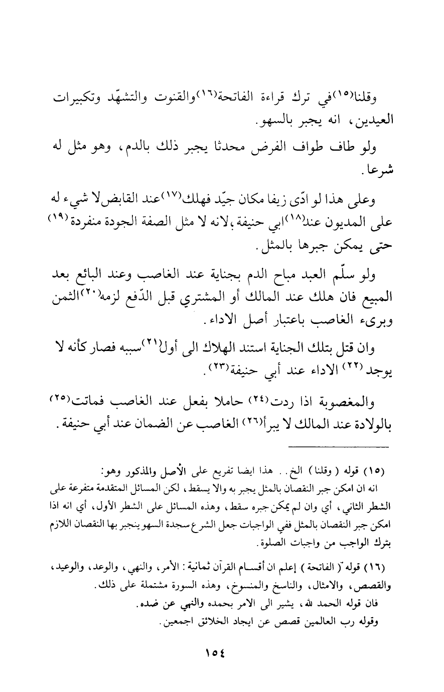 وَقُلْنَا فِي ترك قِرَاءَة الْفَاتِحَة والقنوت وَالتَّشَهُّد وتكبيرات الْعِيدَيْنِ أَنه يجْبر بالسهو