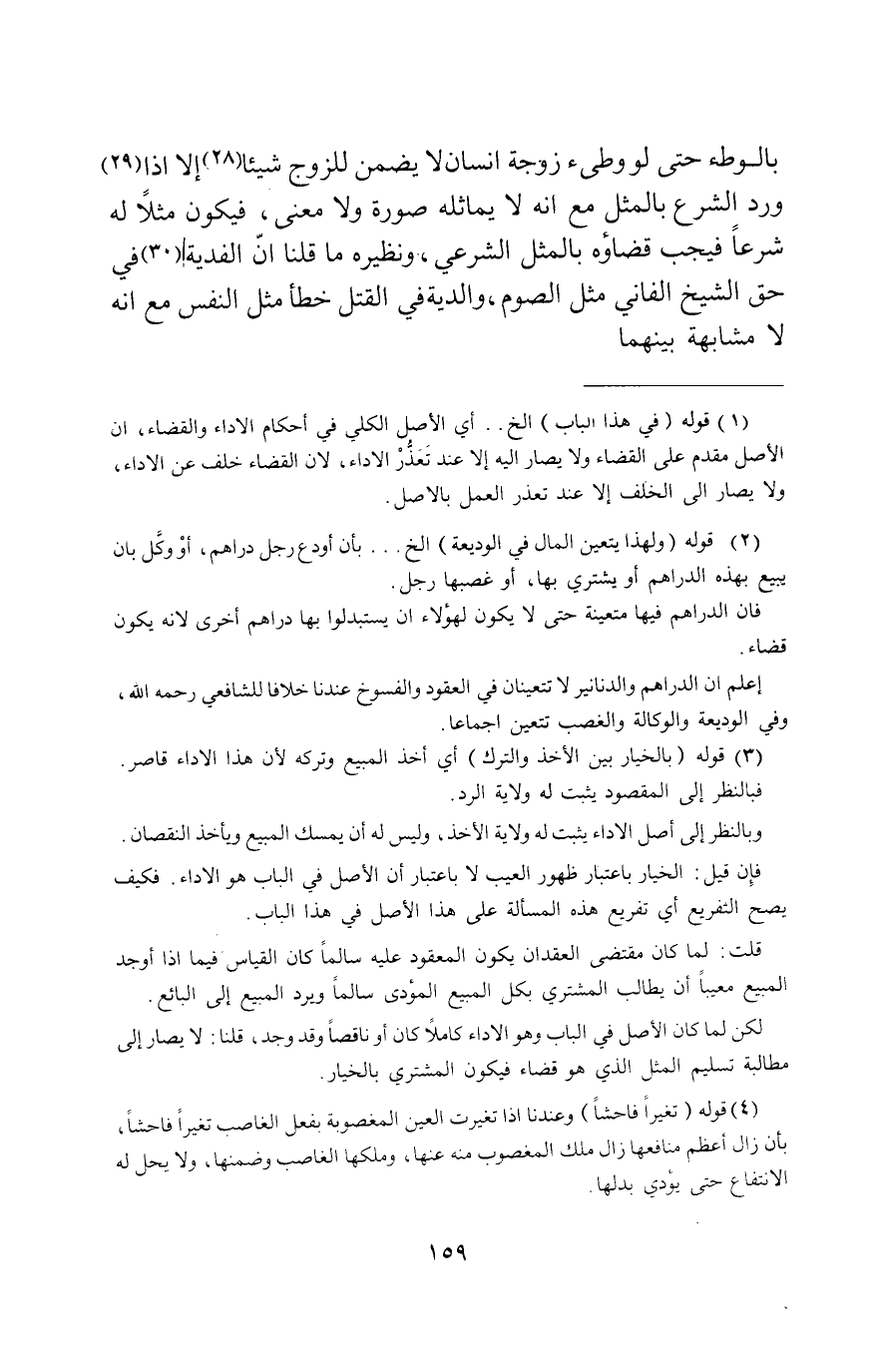 بِالْوَطْءِ حَتَّى لَو وطئ زَوْجَة إِنْسَان لَا يضمن للزَّوْج شَيْئا إِلَّا إِذا ورد الشَّرْع بِالْمثلِ مَعَ أَنه لَا يماثله صُورَة وَمعنى فَيكون مثلا لَهُ شرعا فَيجب قَضَاؤُهُ بِالْمثلِ الشَّرْعِيّ وَنَظِيره مَا قُلْنَا أَن الْفِدْيَة فِي حق الشَّيْخ الفاني مثل الصَّوْم وَالدية فِي الْقَتْل خطأ مثل النَّفس مَعَ أَنه لَا مشابهة بَينهمَا