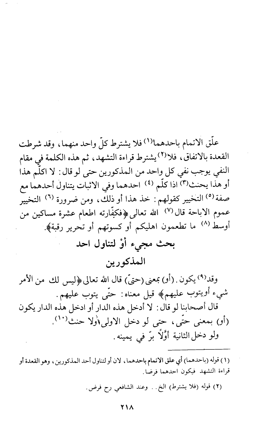 علق الأتمام بإحدهما فَلَا يشْتَرط كل وَاحِد مِنْهُمَا وَقد شرطت الْقعدَة بالِاتِّفَاقِ فَلَا يشْتَرط قِرَاءَة التَّشَهُّد ثمَّ هَذِه الْكَلِمَة فِي مقَام النَّفْي يُوجب نفي كل وَاحِد من الْمَذْكُورين حَتَّى لَو قَالَ لَا أكلم هَذَا أَو هَذَا يَحْنَث إِذا كلم أَحدهمَا وَفِي الْإِثْبَات يتَنَاوَل أَحدهمَا مَعَ صفة التَّخْيِير كَقَوْلِهِم خُذ هَذَا أَو ذَلِك وَمن ضَرُورَة التَّخْيِير عُمُوم الْإِبَاحَة قَالَ الله تَعَالَى {فكفارته إطْعَام عشرَة مَسَاكِين من أَوسط مَا تطْعمُونَ أهليكم أَو كسوتهم أَو تَحْرِير رَقَبَة}