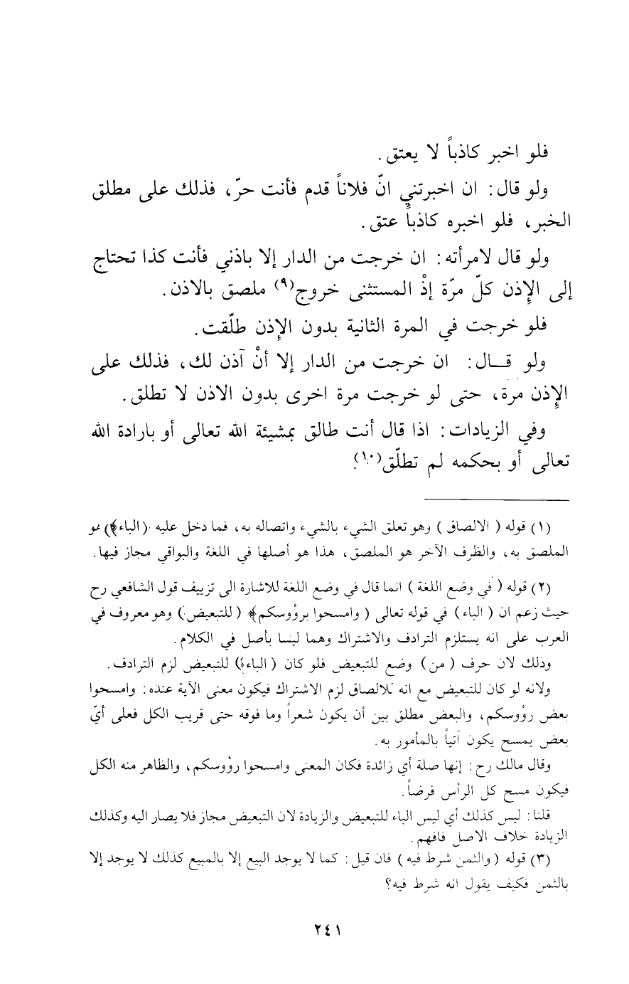 وَلَو قَالَ لامْرَأَته إِن خرجت من الدَّار إِلَّا بإذني فَأَنت كَذَا تحْتَاج إِلَى الْإِذْن كل مرّة إِذْ الْمُسْتَثْنى خُرُوج ملصق بِالْإِذْنِ