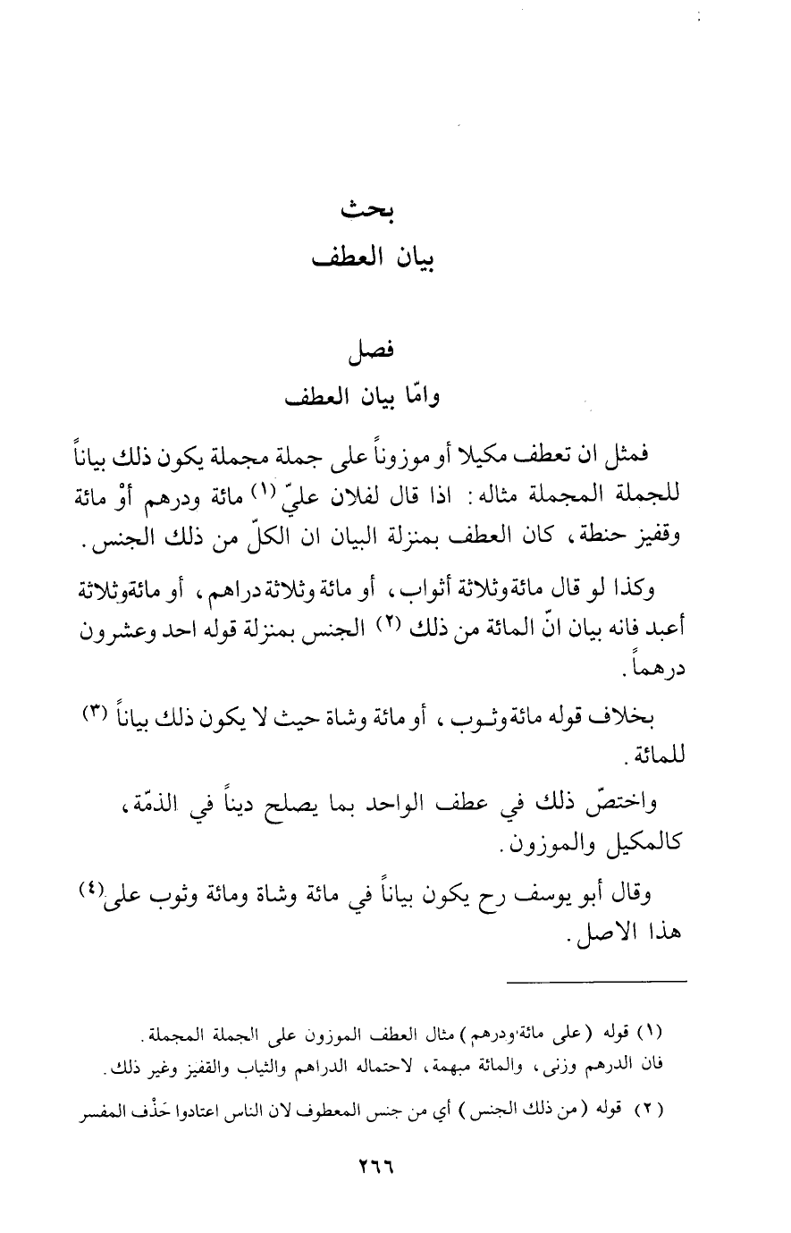 فَمثل أَن تعطف مَكِيلًا أَو مَوْزُونا على جملَة مجملة يكون ذَلِك بَيَانا للجملة المجملة مِثَاله إِذا قَالَ لفُلَان عَليّ مائَة دِرْهَم أَو مائَة وقفيز حِنْطَة كَانَ الْعَطف بِمَنْزِلَة الْبَيَان أَن الْكل من ذَلِك الْجِنْس