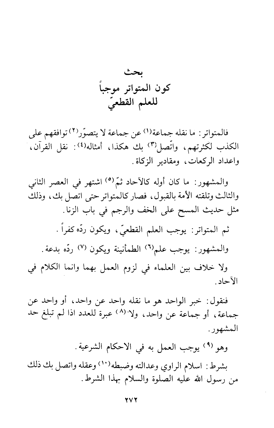 فالمتواتر مَا نَقله جمَاعَة عَن جمَاعَة لَا يتَصَوَّر توافقهم على الْكَذِب لكثرتهم واتصل بك هَكَذَا أَمْثَاله نقل الْقُرْآن وإعداد الرَّكْعَات ومقادير الزَّكَاة