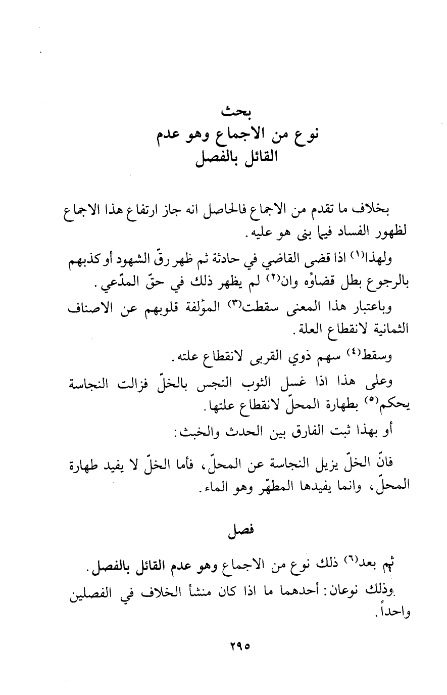 ثمَّ بعد ذَلِك نوع من الْإِجْمَاع وَهُوَ عدم الْقَائِل بِالْفَصْلِ وَذَلِكَ نَوْعَانِ أَحدهمَا مَا إِذا كَانَ منشأ الْخلاف فِي الْفَصْلَيْنِ وَاحِدًا
