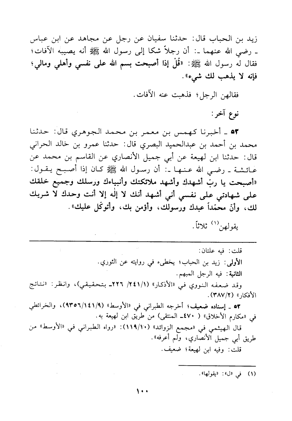 زيد بن الحباب قال: حدثنا سفيان عن رجل عن مجاهد عن ابن عباس - رضي الله عنهما -؛ أن رجلًا شكا إلى رسول الله - صلى الله عليه وسلم - أنه يصيبه الآفات؛ فقال له رسول الله - صلى الله عليه وسلم -: "قُلْ إذا أصبحت بسم الله على نفسي وأهلي ومالي؛ فإنه لا يذهب لك شيء".