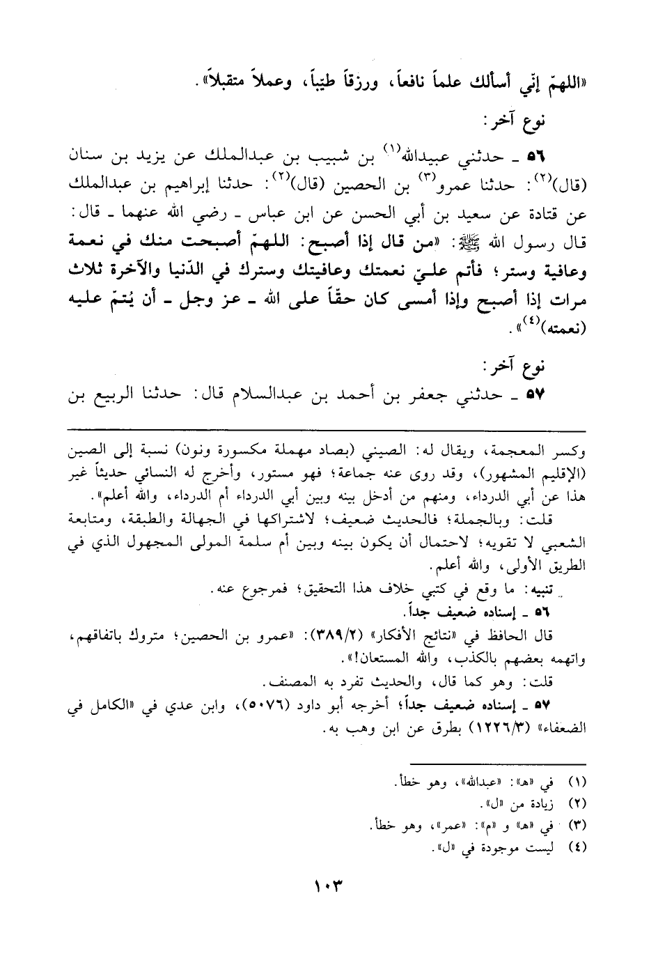 56 - حدثني عبيد الله (¬1) بن شبيب بن عبد الملك عن يزيد بن سنان (قال) (¬2): حدثنا عمرو (¬3) بن الحصين (قال) (2): حدثنا إبراهيم بن عبد الملك عن قتادة عن سعيد بن أبي الحسن عن ابن عباس - رضي الله عنهما- قال: قال رسول الله - صلى الله عليه وسلم -: "من قال إذا أصبح: اللهمّ أصبحت منك في نعمة وعافية وستر، فأتم عليّ نعمتك وعافيتك وسترك في الدّنيا والآخرة ثلاث