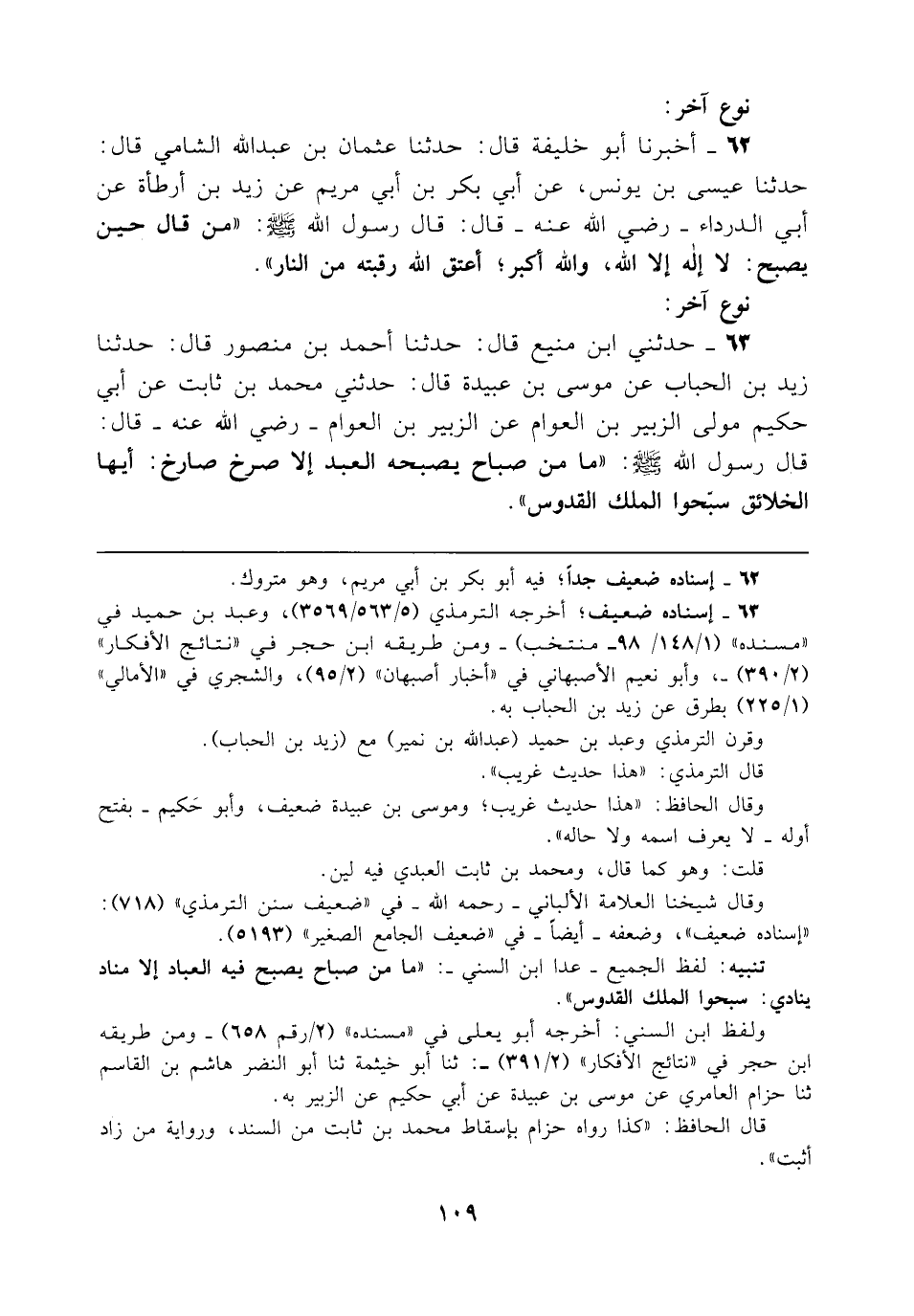 63 - حدثني ابن منيع قال: حدثنا أحمد بن منصور قال: حدثنا زيد بن الحباب عن موسى بن عبيدة قال: حدثني محمَّد بن ثابت عن أبي حكيم مولى الزبير بن العوام عن الزبير بن العوام - رضي الله عنه - قال: قال رسول الله - صلى الله عليه وسلم -: "ما من صباح يصبحه العبد إلا صرخ صارخ: أيها الخلائق سبّحوا الملك القدوس".