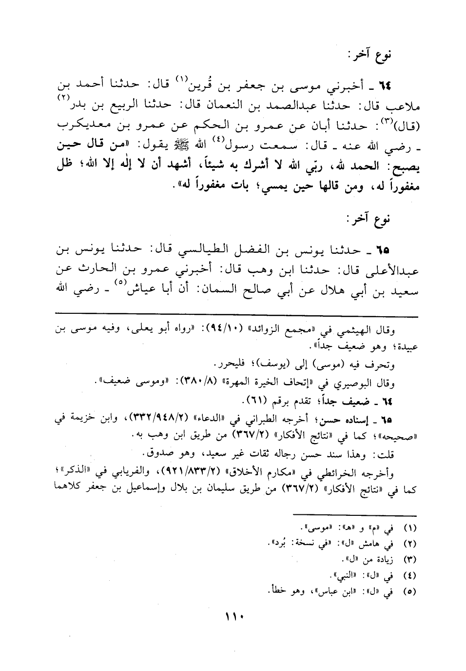 64 - أخبرني موسى بن جعفر بن قُرين (¬1) قال: حدثنا أحمد بن ملاعب قال: حدثنا عبد الصمد بن النعمان قال: حدثنا الربيع بن بدر (¬2) (قال) (¬3): حدثنا أبان عن عمرو بن الحكم عن عمرو بن معديكرب - رضي الله عنه - قال: سمعت رسول (¬4) الله - صلى الله عليه وسلم - يقول: "من قال حين يصبح: الحمد لله، ربي الله لا أشرك به شيئًا، أشهد أن لا إله إلا الله؛ ظل مغفورًا له، ومن قالها حين يمسي؛ بات مغفورًا له".