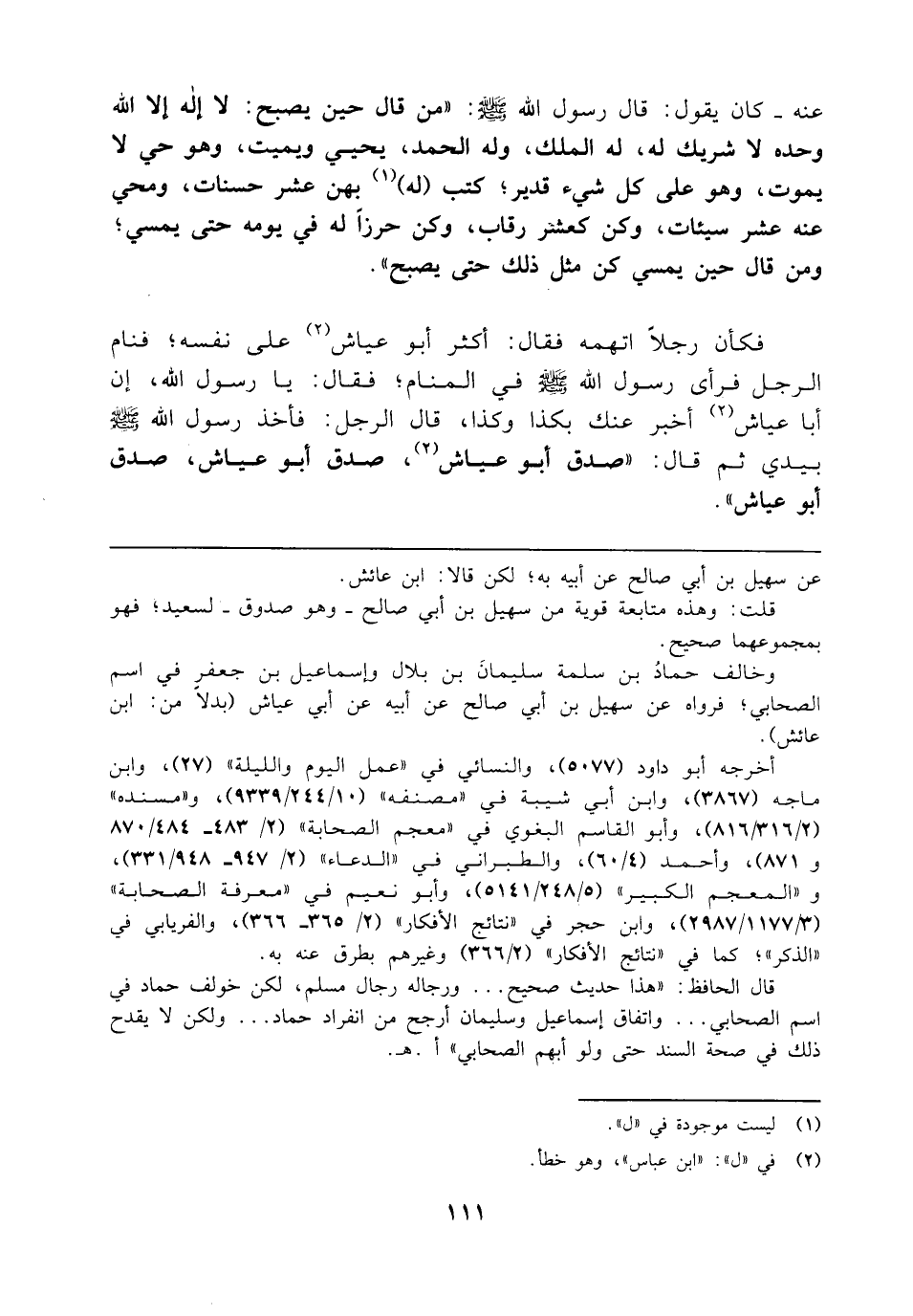 فكأن رجلًا اتهمه فقال: أكثر أبو عياش (¬2) على نفسه؛ فنام الرجل فرأى رسول الله - صلى الله عليه وسلم - في المنام، فقال: يا رسول الله، إن أبا عياش (2) أخبر عنك بكذا وكذا، قال الرجل: فأخذ رسول الله - صلى الله عليه وسلم - بيدي ثم قال: "صدق أبو عياش (2)، صدق أبو عياش، صدق أبو عياش".