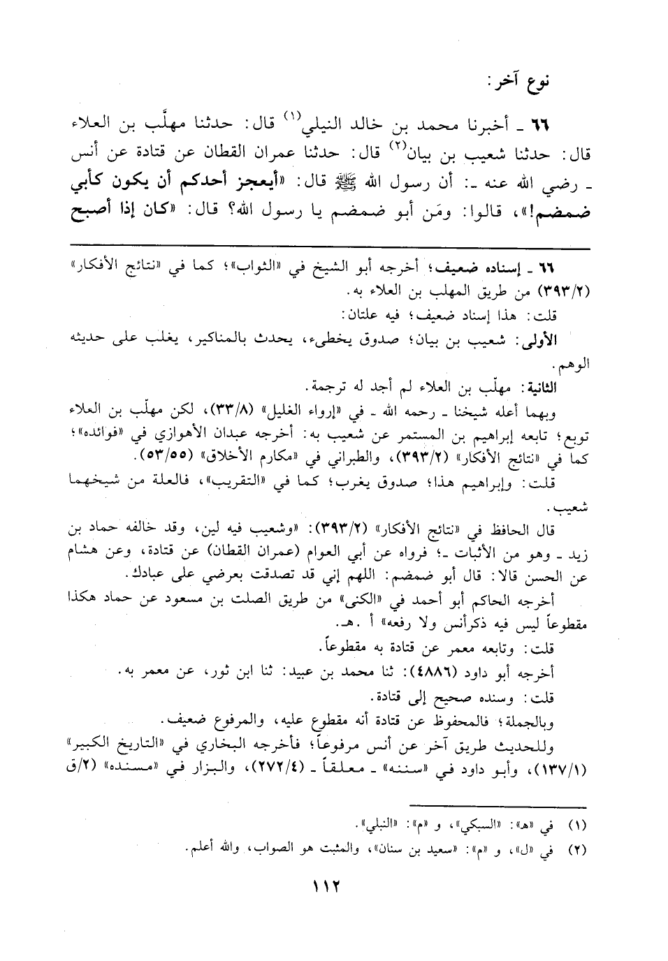 قال الحافظ في "نتائج الأفكار" (2/ 393): "وشعيب فيه لين، وقد خالفه حماد بن زيد -وهو من الأثبات-؛ فرواه عن أبي العوام (عمران القطان) عن قتادة، وعن هشام عن الحسن قالا: قال أبو ضمضم: اللهم إني قد تصدقت بعرضي على عبادك.