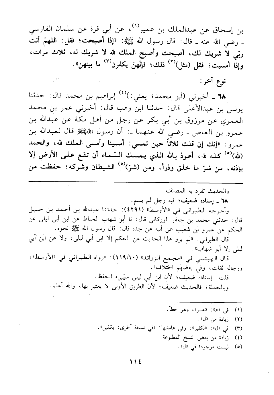 بن إسحاق عن عبد الملك بن عمير (¬1)، عن أبي قرة عن سلمان الفارسي - رضي الله عنه - قال: قال رسول الله - صلى الله عليه وسلم -: "إذا أصبحت؛ فقل: اللهمّ أنت ربّي لا شريك لك، أصبحت وأصبح الملك لله لا شريك له، ثلاث مرات، وإذا أمسيت؛ فقل (مثل) (¬2) ذلك؛ فإنّهنّ يكفرن (¬3) ما بينهن".