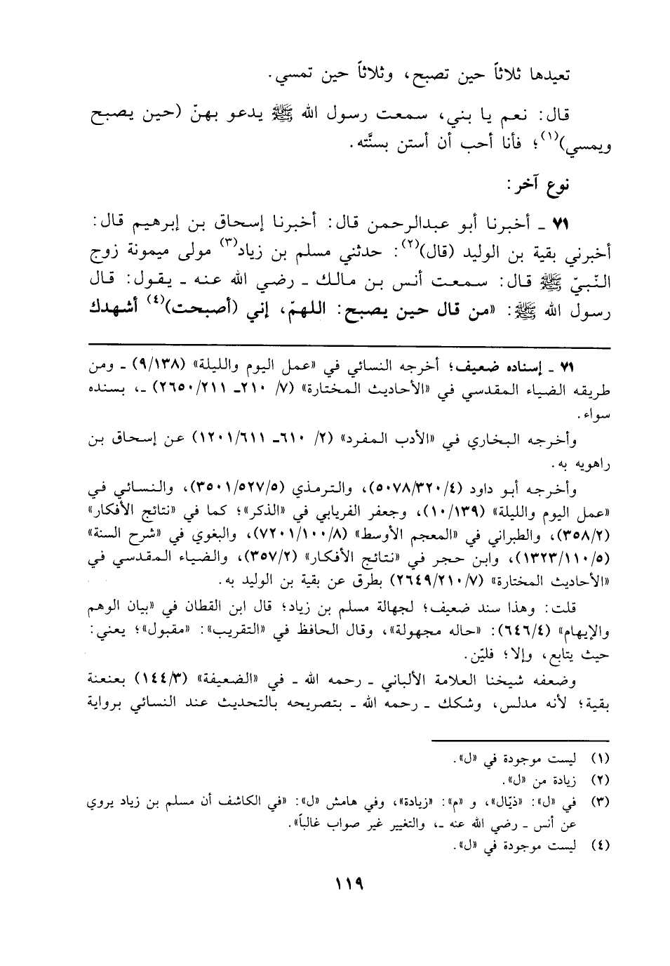 71 - أخبرنا أبو عبد الرحمن قال: أخبرنا إسحاق بن إبرهيم قال: أخبرني بقية بن الوليد (قال) (¬2): حدثني مسلم بن زياد (¬3) مولى ميمونة زوج النّبيّ - صلى الله عليه وسلم - قال: سمعت أنس بن مالك - رضي الله عنه - يقول: قال رسول الله - صلى الله عليه وسلم -: "من قال حين يصبح: اللهمّ، إني (أصبحت) (¬4) أشهدك