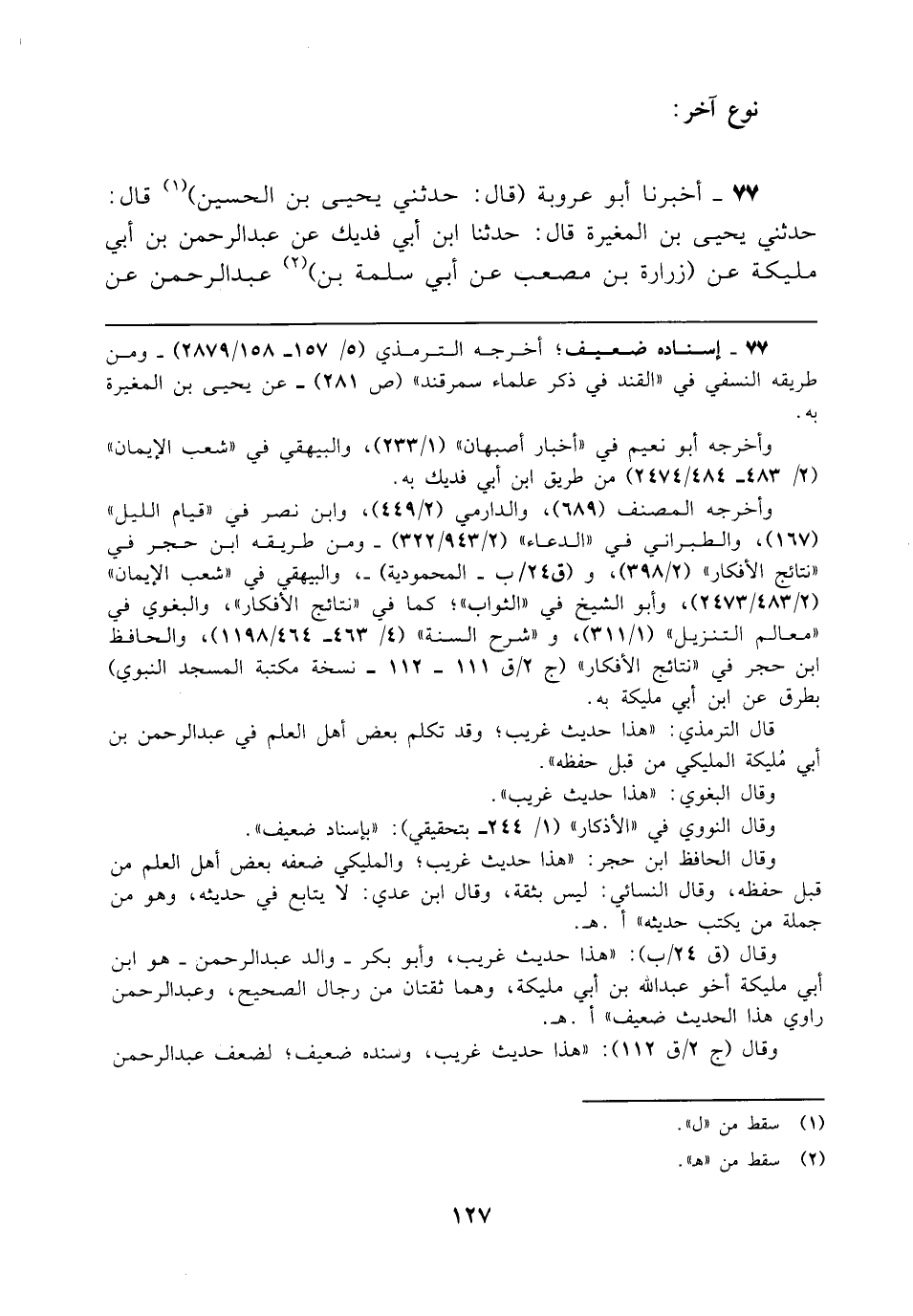 77 - إسناده ضعيف؛ أخرجه الترمذي (5/ 157 - 158/ 2879) - ومن طريقه النسفي في "القند في ذكر علماء سمرقند" (ص 281) - عن يحيى بن المغيرة وأخرجه أبو نعيم في "أخبار أصبهان" (1/ 233)، والبيهقي في "شعب الإيمان" (2/ 483 - 484/ 2474) من طريق ابن أبي فديك به.
