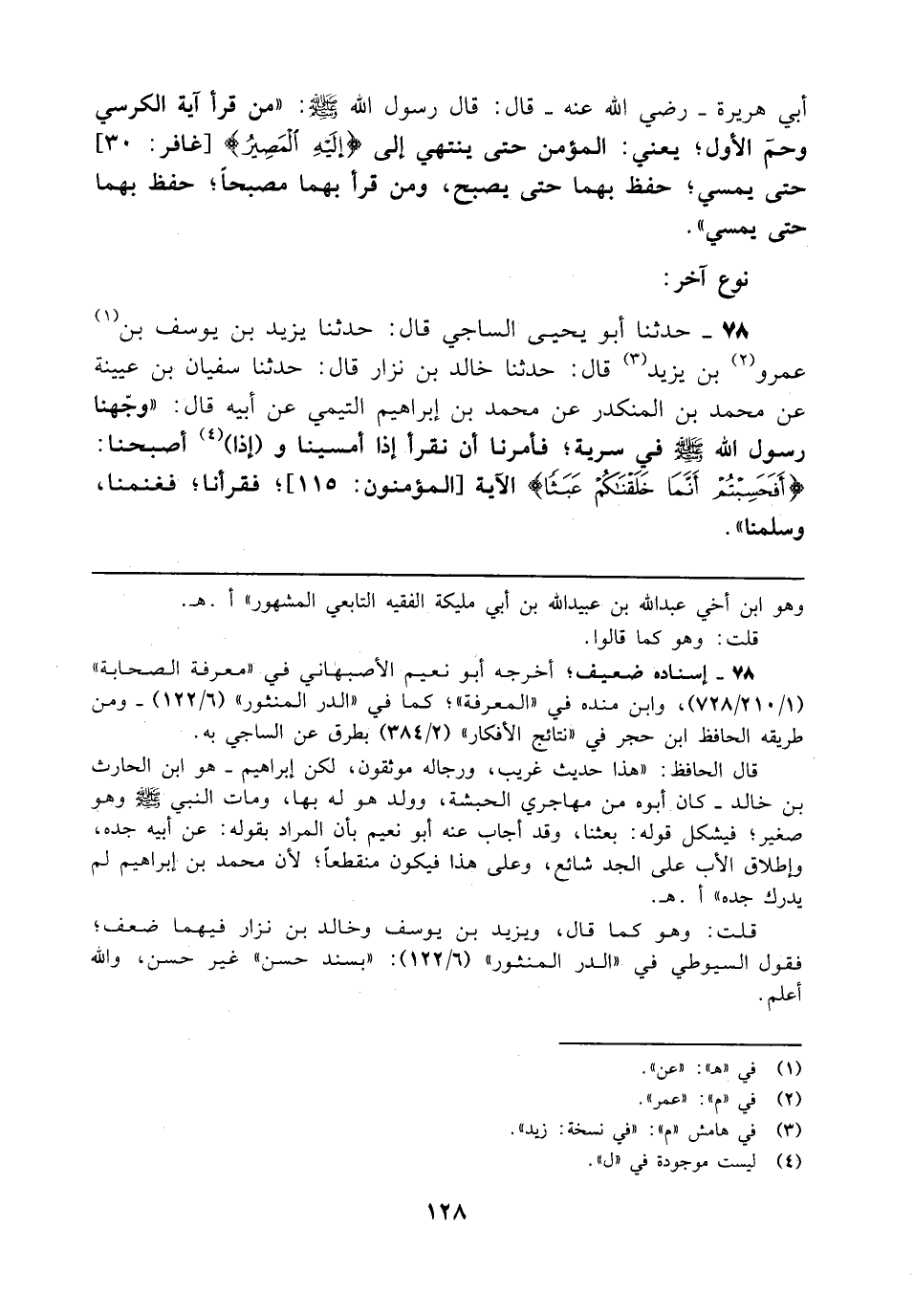 78 - حدثنا أبو يحيى الساجي قال: حدثنا يزيد بن يوسف بن (¬1) عمرو (¬2) بن يزيد (¬3) قال: حدثنا خالد بن نزار قال: حدثنا سفيان بن عيينة عن محمَّد بن المنكدر عن محمَّد بن إبراهيم التيمي عن أبيه قال: "وجّهنا رسول الله - صلى الله عليه وسلم - في سرية؛ فأمرنا أن نقرأ إذا أمسينا و (إذا) (¬4) أصبحنا: {أَفَحَسِبْتُمْ أَنَّمَا خَلَقْنَاكُمْ عَبَثًا} الآية [المؤمنون: 115]؛ فقرأنا؛ فغنمنا، وسلمنا".