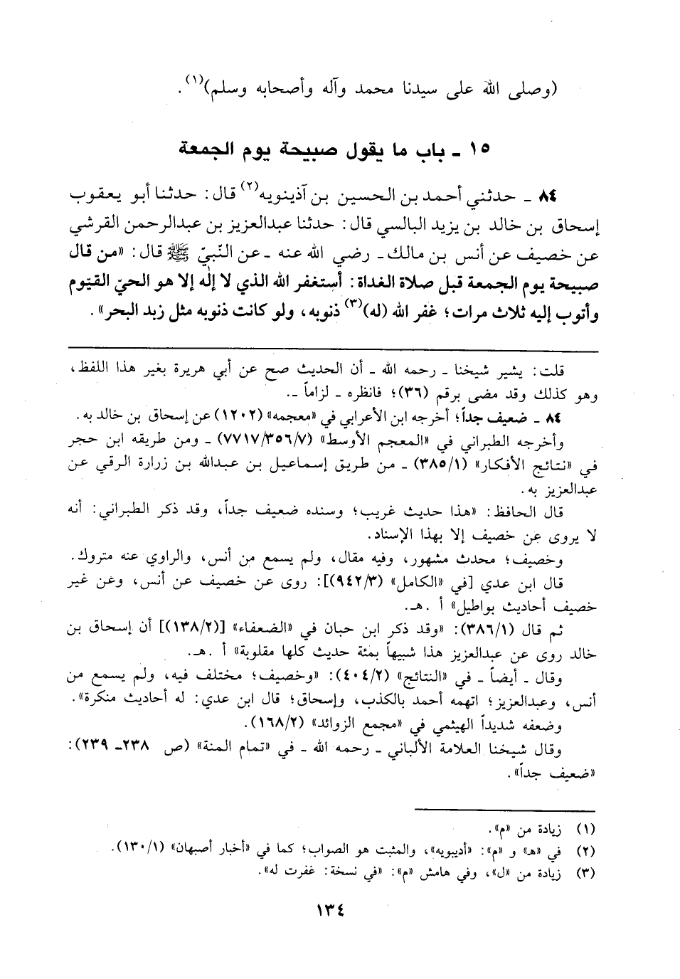 84 - حدثني أحمد بن الحسين بن آذينويه (¬2) قال: حدثنا أبو يعقوب إسحاق بن خالد بن يزيد البالسي قال: حدثنا عبد العزيز بن عبد الرحمن القرشي عن خصيف عن أنس بن مالك - رضي الله عنه - عن النّبيّ - صلى الله عليه وسلم - قال: "من قال صبيحة يوم الجمعة قبل صلاة الغداة: أستغفر الله الذي لا إله إلا هو الحيّ القيّوم وأتوب إليه ثلاث مرات؛ غفر الله (له) (¬3) ذنوبه، ولو كانت ذنوبه مثل زبد البحر".