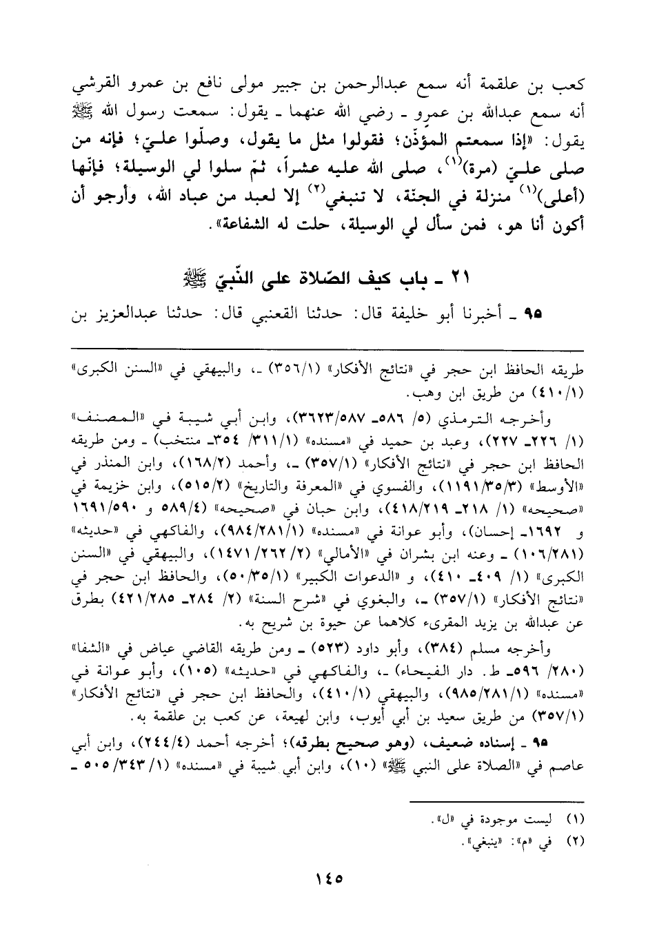 كعب بن علقمة أنه سمع عبد الرحمن بن جبير مولى نافع بن عمرو القرشي أنه سمع عبد الله بن عمرِو - رضي الله عنهما - يقول: سمعت رسول الله - صلى الله عليه وسلم - يقول: "إذا سمعتم المؤذّن؛ فقولوا مثل ما يقول، وصلّوا عليّ؛ فإنه من صلى عليّ (مرة) (¬1)، صلى الله عليه عشرًا، ثمّ سلوا لي الوسيلة؛ فإنّها (أعلى) (1) منزلة في الجنّة، لا تنبغي (¬2) إلا لعبد من عباد الله، وأرجو أن أكون أنا هو، فمن سأل لي الوسيلة، حلت له الشفاعة".