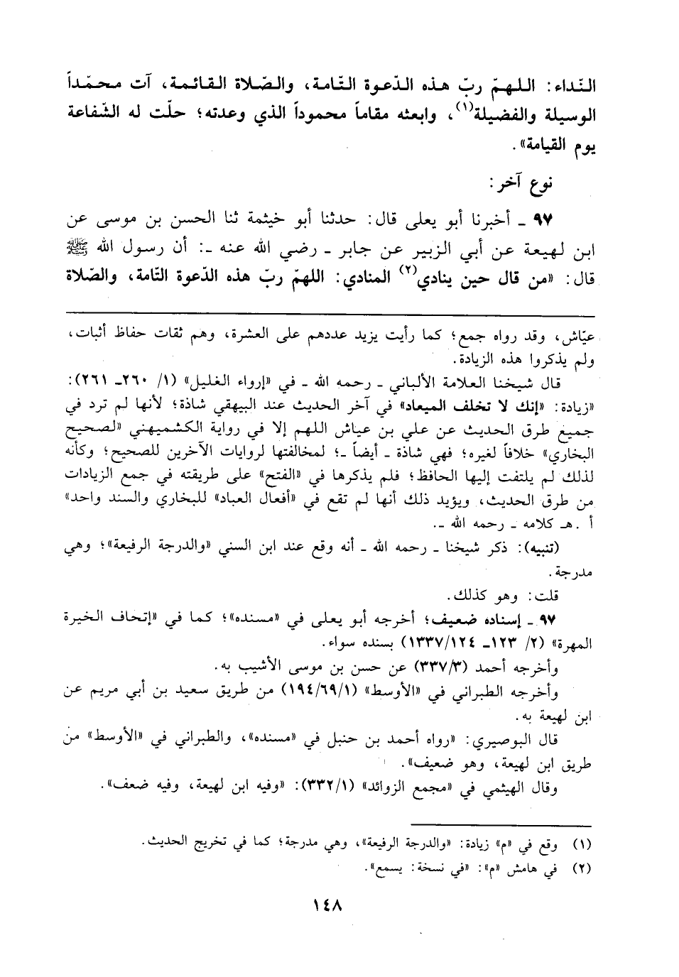 97 - أخبرنا أبو يعلى قال: حدثنا أبو خيثمة ثنا الحسن بن موسى عن ابن لهيعة عن أبي الزبير عن جابر - رضي الله عنه -: أن رسول الله - صلى الله عليه وسلم - قال: "من قال حين ينادي (¬2) المنادي: اللهمّ ربّ هذه الدّعوة التامة، والصّلاة