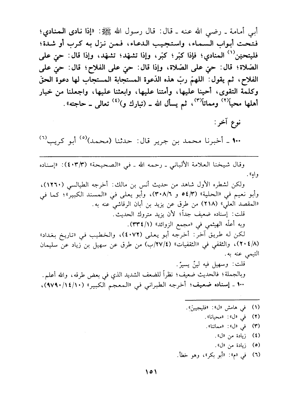 أبي أمامة - رضي الله عنه - قال: قال رسول الله - صلى الله عليه وسلم -: "إذا نادى المنادي؛ فتحت أبواب السماء، واستجيب الدعاء، فمن نزل به كرب أو شدة؛ فليتحيّن (¬1) المنادي؛ فإذا كبّر؛ كبّر، وإذا تشهّد؛ تشهّد، وإذا قال: حيّ على الصّلاة؛ قال: حيّ على الصّلاة، وإذا قال: حيّ على الفلاح؛ قال: حيّ على الفلاح، ثم يقول: اللهمّ ربّ هذه الدّعوة المستجابة المستجاب لها دعوة الحقّ وكلمة التقوى، أحينا عليها، وأمتنا عليها، وابعثنا عليها، واجعلنا من خيار أهلها محيًا (¬2) ومماتًا (¬3)، ثم يسأل الله - (تبارك و) (¬4) تعالى - حاجته".