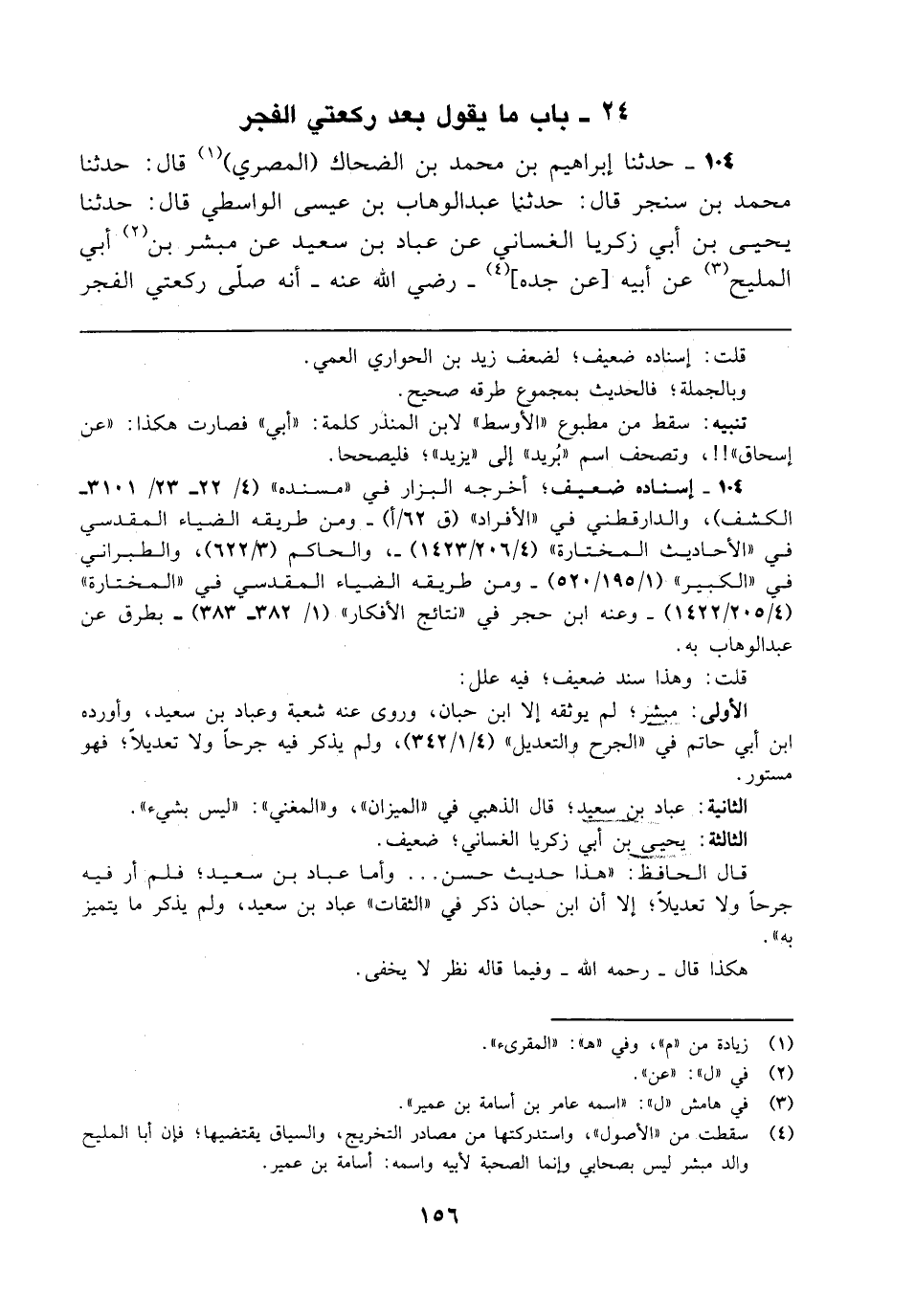 104 - حدثنا إبراهيم بن محمد بن الضحاك (المصري) (¬1) قال: حدثنا محمد بن سنجر قال: حدثبا عبد الوهاب بن عيسى الواسطي قال: حدثنا يحيى بن أبي زكريا الغساني عن عباد بن سعيد عن مبشر بن (¬2) أبي المليح (¬3) عن أبيه [عن جده] (¬4) - رضي الله عنه - أنه صلى ركعتي الفجر