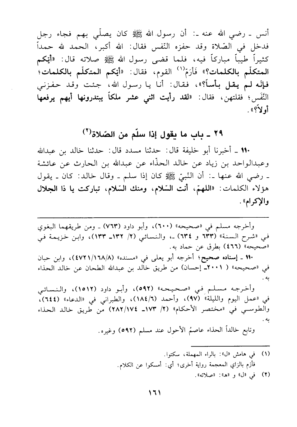 110 - أخبرنا أبو خليفة قال: حدثنا مسدد قال: حدثنا خالد بن عبد الله وعبد الواحد بن زياد عن خالد الحذاء عن عبد الله بن الحارث عن عائشة - رضي الله عنها -: أن النّبيّ - صلى الله عليه وسلم - كان إذا سلم - وقال خالد: كان - يقول هؤلاء الكلمات: "اللهمّ، أنت السّلام، ومنك السّلام، تباركت يا ذا الجلال والإكرام".