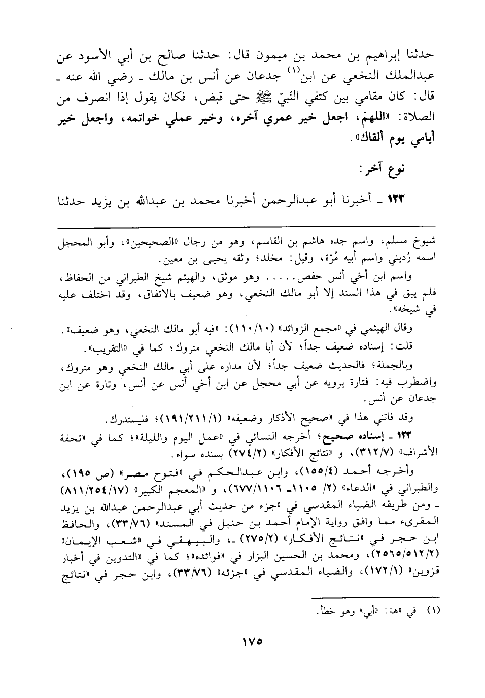 واسم ابن أخي أنس حفص ..... وهو موثق، والهيثم شيخ الطبراني من الحفاظ، فلم يبق في هذا السند إلا أبو مالك النخعي، وهو ضعيف بالاتفاق، وقد اختلف عليه في شيخه".