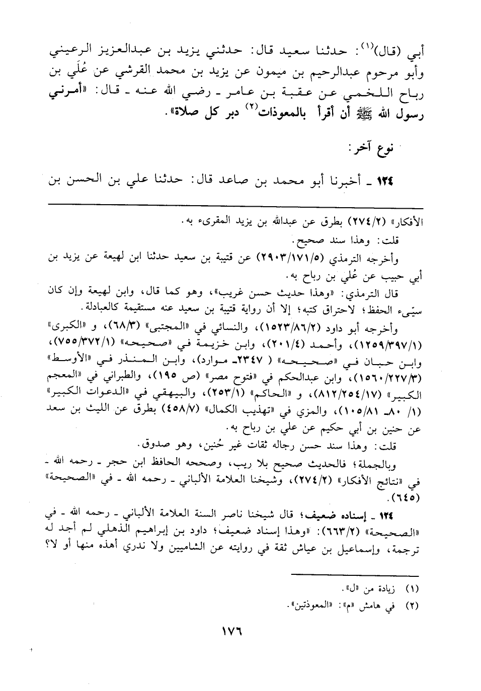أبي (قال) (¬1): حدثنا سعيد قال: حدثني يزيد بن عبد العزيز الرعيني وأبو مرحوم عبد الرحيم بن ميمون عن يزيد بن محمد القرشي عن عُلَي بن رباح اللخمي عن عقبة بن عامر - رضي الله عنه - قال: "أمرني رسول الله - صلى الله عليه وسلم - أن أقرأ بالمعوذات (¬2) دبر كل صلاة".