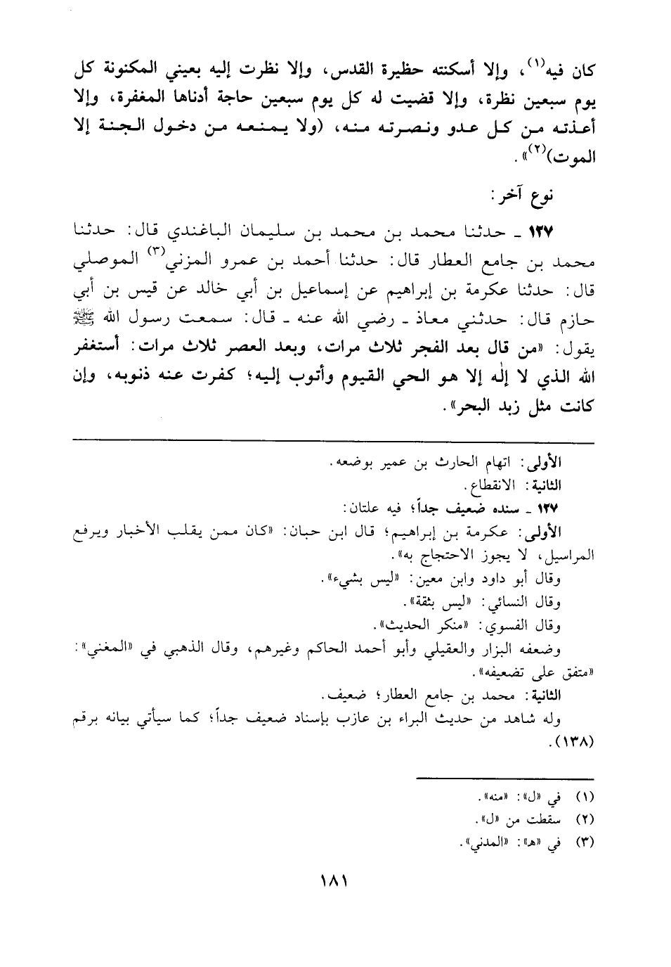 127 - حدثنا محمد بن محمد بن سليمان الباغندي قال: حدثنا محمد بن جامع العطار قال: حدثنا أحمد بن عمرو المزني (¬3) الموصلي قال: حدثنا عكرمة بن إبراهيم عن إسماعيل بن أبي خالد عن قيس بن أبي حازم قال. حدثني معاذ - رضي الله عنه - قال: سمعت رسول الله - صلى الله عليه وسلم - يقول: "من قال بعد الفجر ثلاث مرات، وبعد العصر ثلاث مرات: أستغفر الله الذي لا إله إلا هو الحي القيوم وأتوب إليه؛ كفرت عنه ذنوبه، وإن كانت مثل زبد البحر".